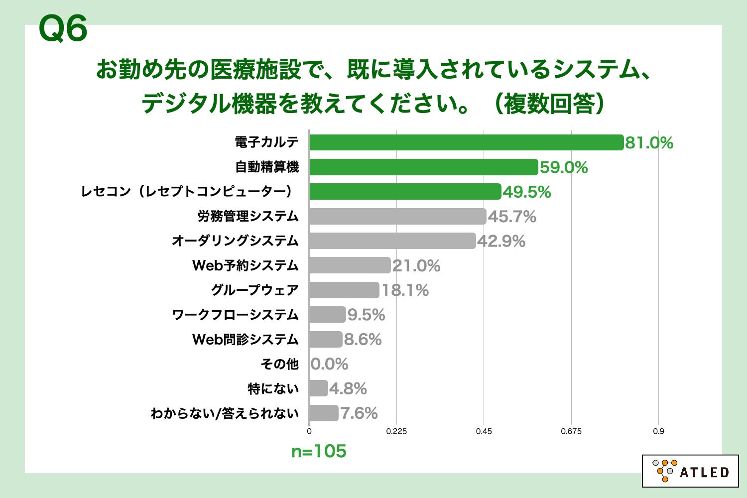 「Q6.お勤め先の医療施設で、既に導入されているシステム、デジタル機器を教えてください。(複数回答)」(n=105)と質問したところ、「電子カルテ」が81.0%、「自動精算機」が59.0%、「レセコン(レセプトコンピューター)」が49.5%という回答となりました。