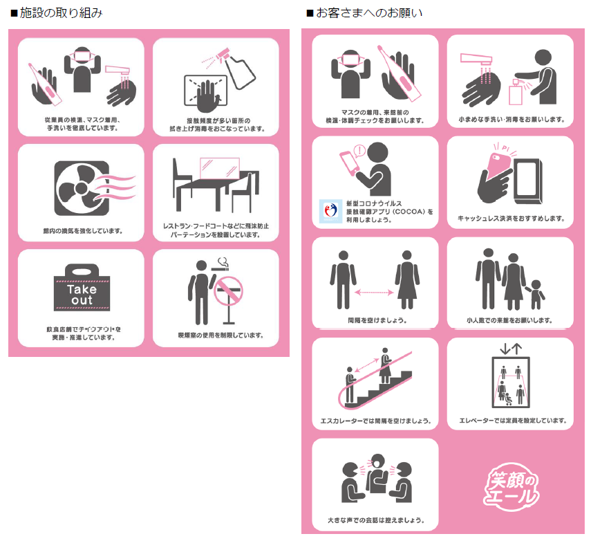 三井不動産グループが運営する商業施設では、新型コロナウイルス感染拡大防止のため下記をはじめとした様々な取り組みを実施しております。