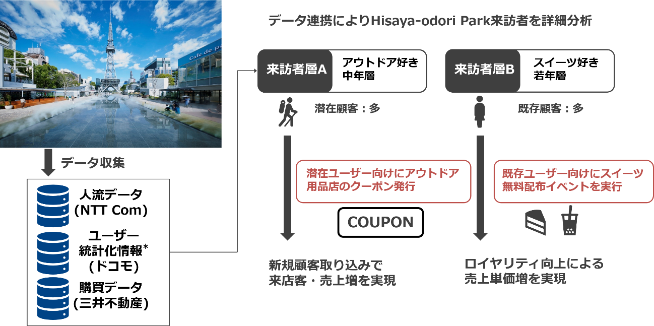 本実証実験では、Hisaya-odori Parkの実店舗から取得する店舗の人流データおよびレジ客動向(客数、属性)の分析に加えて、ドコモが保有するdポイントクラブ会員8,700万人以上※2 の会員基盤と顧客理解技術※3 を用いたデジタルマーケティングを取り入れた来店促進や顧客満足度を高める施策を実施します。また、店舗に対しても新規イベントの検討や新メニュー開発などに資するデータを提供し、来訪ユーザー・テナント店舗双方に役立つデータ活用を検討します。