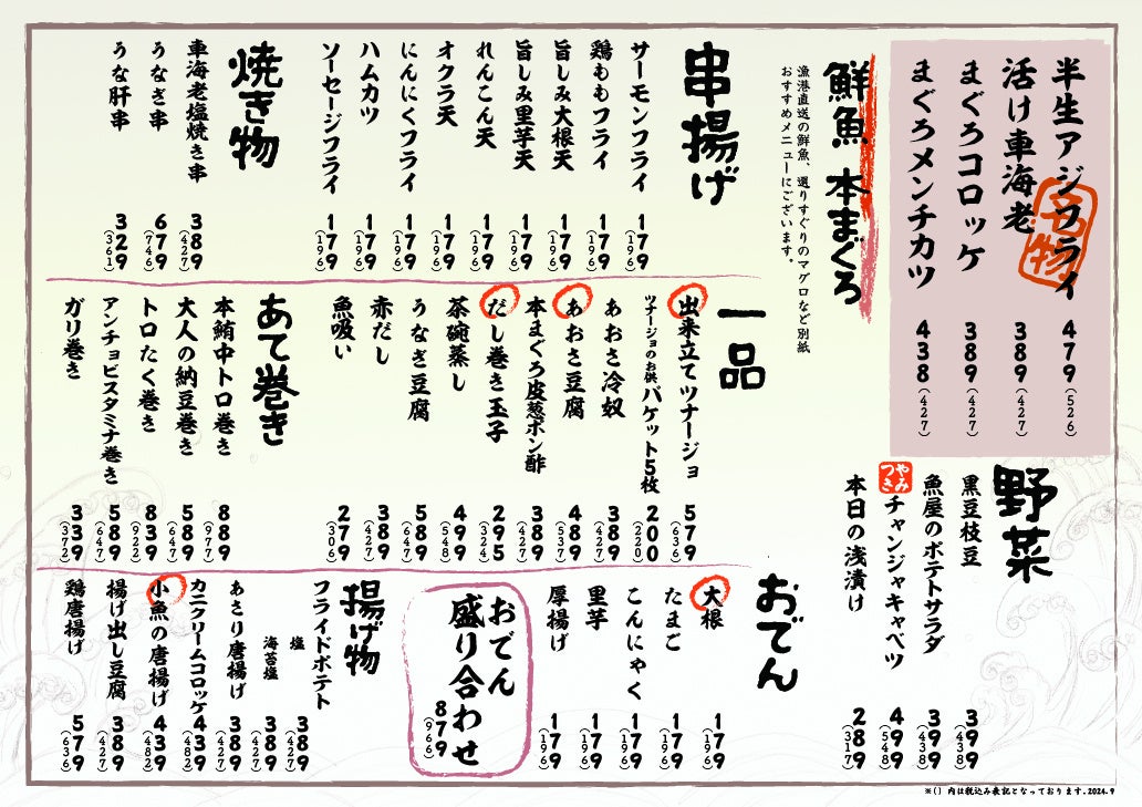いずれの新メニューも、当店の名物「半生アジフライ」や「活け車海老」に負けず劣らず、ビールやサワー、ハイボールに相性抜群。また、おでんやお造りといった常連のお客様にお馴染みのメニューも取り揃えておりますので、ぜひこの機会に『アカマル屋鮮魚店』自慢の鮮魚料理をご賞味ください。