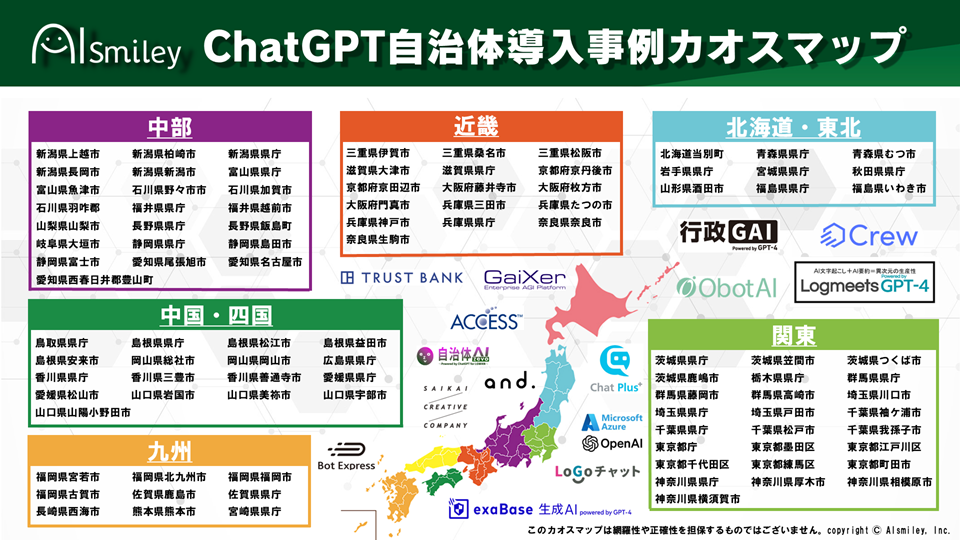 こちらのカオスマップは、自治体のChatGPT導入事例を各自治体ごとに分けてマッピングしております。