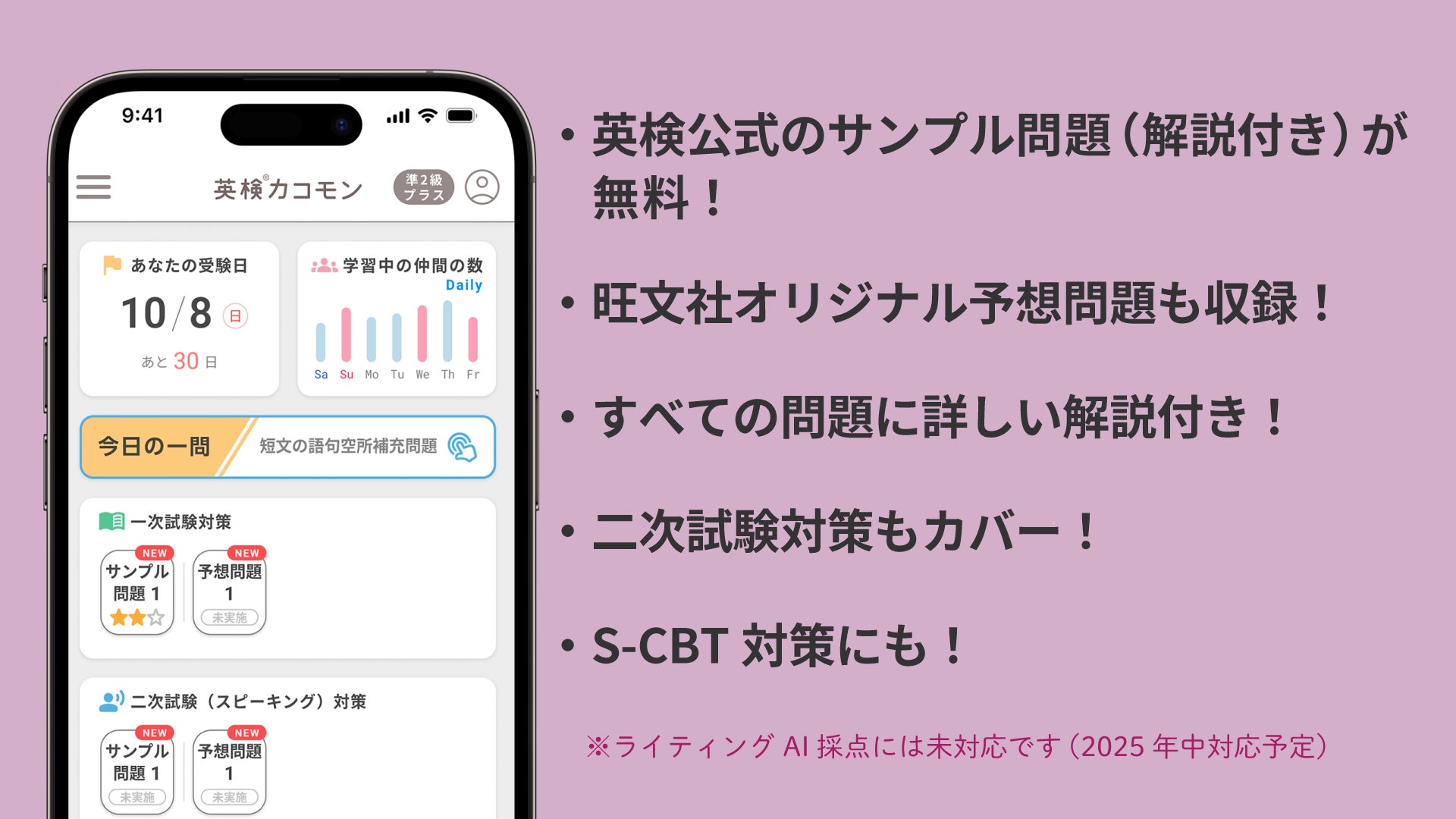 2025年度第1回から導入される準2級プラスの対策として、日本英語検定協会が公開している公式のサンプル問題が解答つきでご利用いただけます。さらに、『英検準2級プラス対策 予想模擬テスト』(旺文社)に掲載の本番形式の予想問題を追加し、一次試験・二次試験対策をサポートいたします(※1)。すべての問題に、英検書売上No.1(※2)の旺文社編集部による詳しい解説が付属し、解答・訳・英文スクリプトなどとともに、ワンタップで確認可能。また、ひとりでは対策が難しい二次試験も、自身の解答と模範解答例とを聞き比べて学習できます。