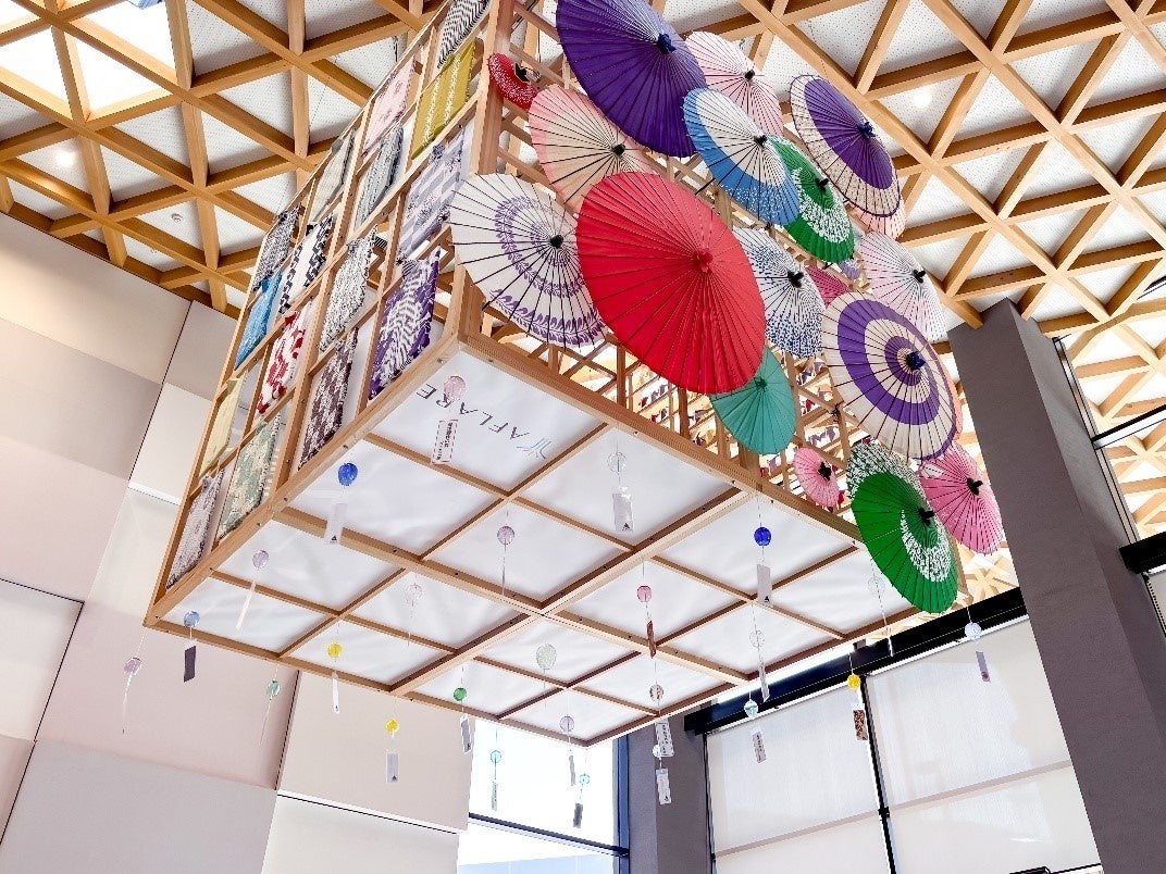 このたび、アフレアホールにて季節演出の一環として風鈴を設置しました。設置された風鈴は金津創作の森「ガラス工房」にて制作されたもので、ガラスならではの透明感と涼やかな音色が特徴です。