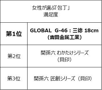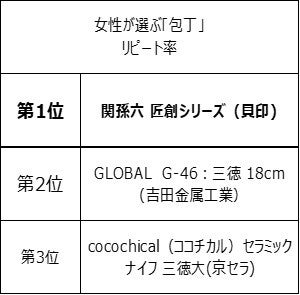2022年11月に実施した調査において、「ヘンケルス ROSTFREI三徳包丁(ツヴィリングJ.A.ヘンケルス ジャパン)」が女性が選ぶ「包丁」利用率第1位に、 「GLOBAL G-46:三徳 18cm(吉田金属工業)」が満足度第1位 、「関孫六 匠創シリーズ(貝印)」がリピート率第1位を受賞しました。