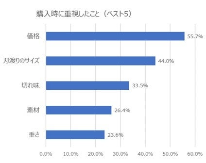 包丁の購入時に重視したことは「価格」 が55.7%と最多、「刃渡りのサイズ」「切れ味」「素材」「重さ」という回答に(複数回答)。