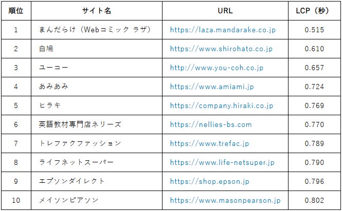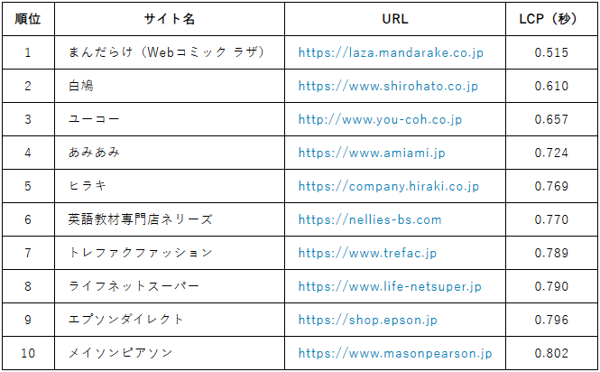 1位「まんだらけ」はLCP 0.515秒・TTFB 0.138秒という驚異的な数値を記録。トップ5はすべて0.8秒未満で、表示速度の最適な状態と言えます。前月2位だった「白鳩」は今月も0.610秒で2位を維持し、「ユーコー」「あみあみ」「ヒラキ」「エプソンダイレクト」といった常連サイトとともに、安定した高パフォーマンスを継続しています。