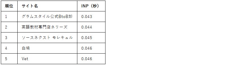 INPのトップ5では、グラムスタイル公式BtoB卸(0.043秒)が最速を記録。注目すべきは2位の「英語教材専門店ネリーズ」と4位の「白鳩」で、両サイトともLCPランキングでも上位(6位・2位)に位置しており、読み込み速度とインタラクション応答性の両面で極めて高い水準を実現しています。