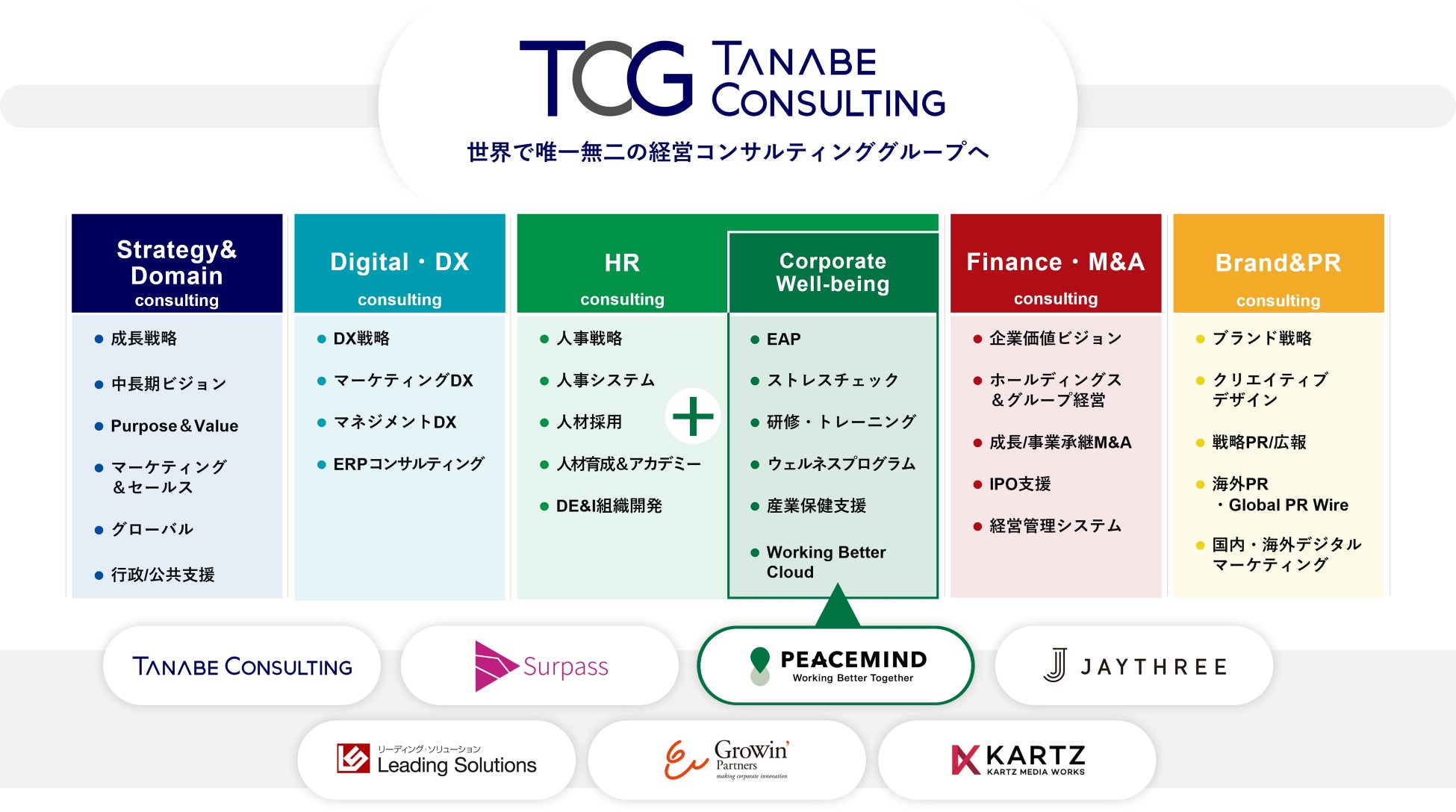 日本における経営コンサルティングのパイオニアであるTCGが、日本における「EAP(従業員支援プログラム)サービス」のパイオニアであるピースマインドと資本業務提携することで、大企業や中堅企業に対する世界でも類を見ないプロフェッショナルサービス、唯一無二の経営コンサルティングサービスの提供を実現できることとなりました。