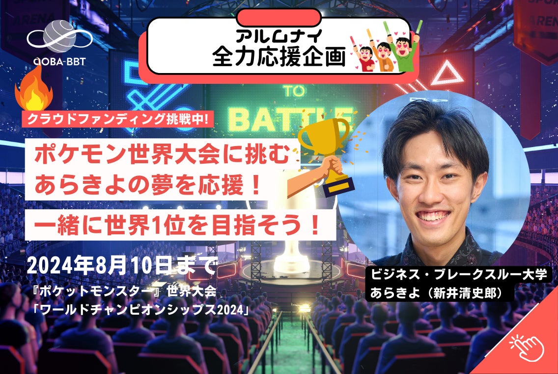 株式会社Aoba-BBT(所在地:東京都千代田区、代表取締役:柴田巌、以下BBT)は、教育分野でのリーディングカンパニーとして、常に進化を続け、未来の教育に貢献しています。この度、Aoba-BBTは、運営する完全100%のオンライン大学である、ビジネス・ブレークスルー大学(以下、BBT大学)の卒業生であり、ポケモン日本チャンピオンの新井清史郎氏(以下、新井氏)が開始したクラウドファンディングを応援することをお知らせいたします。