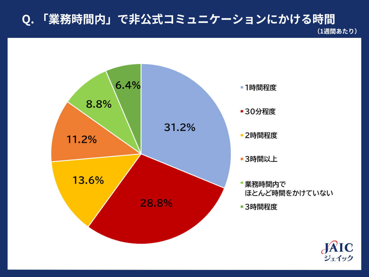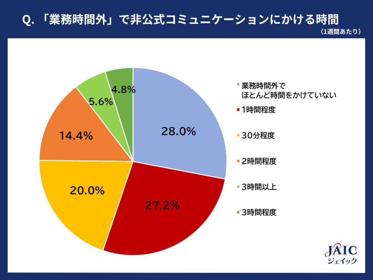 「非公式コミュニケーションにどのくらいの時間をかけていますか?(1週間あたり)」と質問したところ、「業務時間内」では、1位「1時間程度」(31.2%)、2位「30分程度」(28.8%)、3位「2時間程度」(13.6%)、4位「3時間以上」(11.2%)、5位「業務時間内でほとんど時間をかけていない」(8.8%)、6位「3時間程度」(6.4%)となりました。