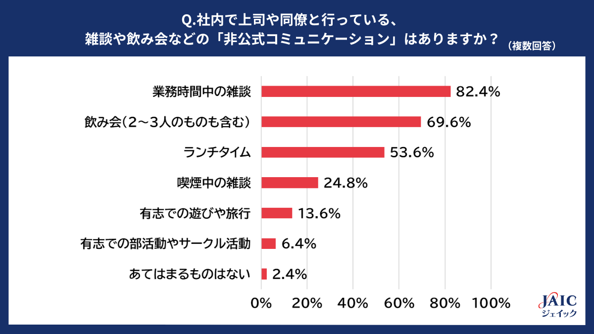 「社内で上司や同僚と行っている、『雑談や飲み会などの非公式コミュニケーション』はありますか?当てはまるものを全て選択してください(オンラインで行われているものも含む)」と質問したところ、1位「業務時間中の雑談」(82.4%)、2位「飲み会(2~3人のものも含む)」(69.6%)、3位「ランチタイム」(53.6%)、4位「喫煙中の雑談」が24.8%、5位「有志での遊びや旅行」が13.6%、6位「有志での部活動やサークル活動」が(6.4%)、7位「あてはまるものはない」(2.4%)となりました。