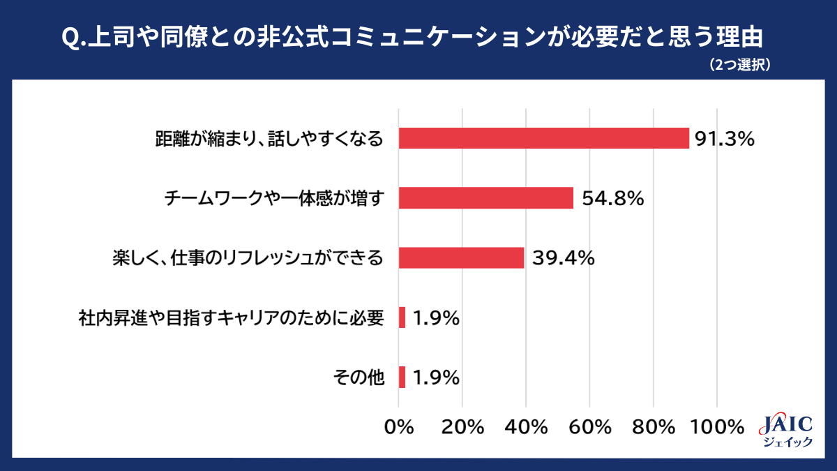 「必要」と回答した方に、「上司や同僚との非公式コミュニケーションが必要だと思う理由として、あてはまるものを2つ選択してください」と質問したところ、1位「距離が縮まり、話しやすくなる」が91.3%、2位「チームワークや一体感が増す」が54.8%、3位「楽しく、仕事のリフレッシュができる」が39.4%、4位「社内昇進や目指すキャリアのために必要」が1.9%、5位「その他」が1.9%となり、チームや個人間の人間関係を良好にさせるために必要と感じている方が多いことがわかりました。