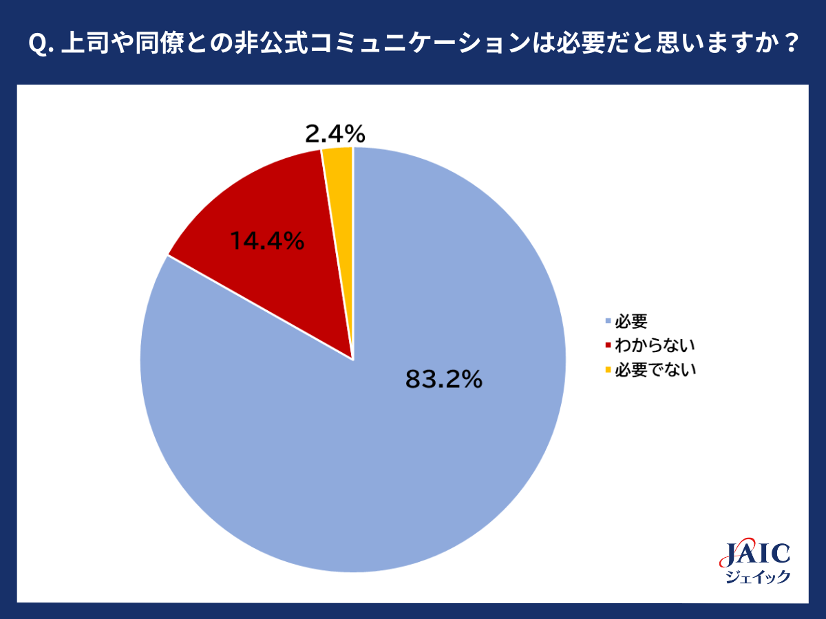 「上司や同僚との非公式コミュニケーションは必要だと思いますか?」と質問したところ、「必要」が最多の83.2%、次いで「わからない」が14.4%、「必要でない」が2.4%となり、8割以上の若手社員が非公式コミュニケーションの必要性を感じていることがわかりました。