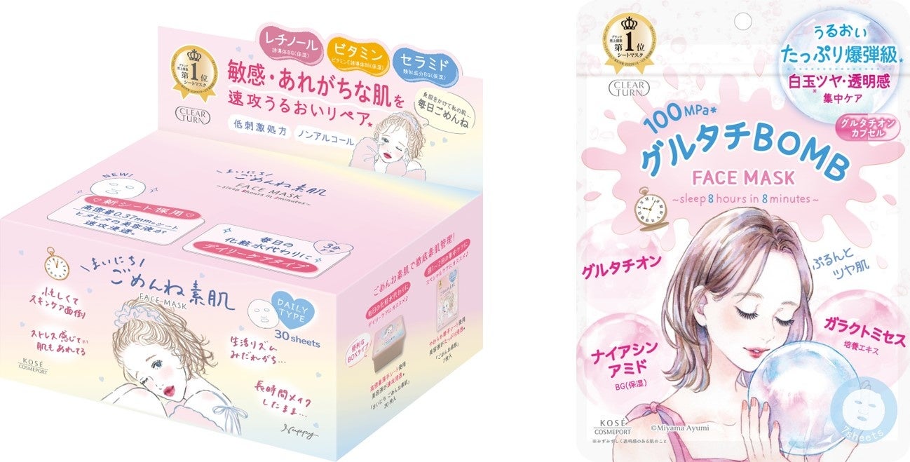 コーセーコスメポート株式会社(本社:東京都中央区、代表取締役社長:小林 孝雄)は、スキンケアブランド『クリアターン』において、人気イラストレーターNappyさんとコラボレーションした「ごめんね素肌」シリーズから、毎日の化粧水代わりに使える「まいにちごめんね素肌マスク」(1品目1品種、ノープリントプライス)を2025年2月21日に、同じく人気イラストレーターミヤマアユミさんとコラボレーションした「BOMB」シリーズから、話題のグルタチオン(保湿)を配合した「グルタチBOMB マスク」(1品目1品種、ノープリントプライス)を3月21日より全国の量販店・ドラッグストアを中心に発売します。