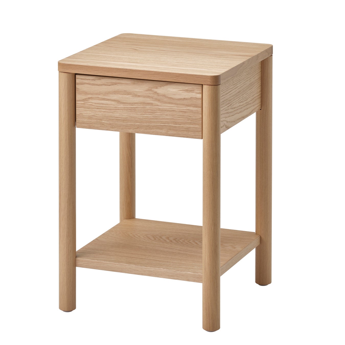無垢材製の丸い脚がエレガントでクラシックなデザインに、美しいブラッシュ仕上げの突き板を組み合わせたサイドテーブルです。取っ手のない引き出しが、タイムレスな印象を与え、どんな部屋にも馴染みます。