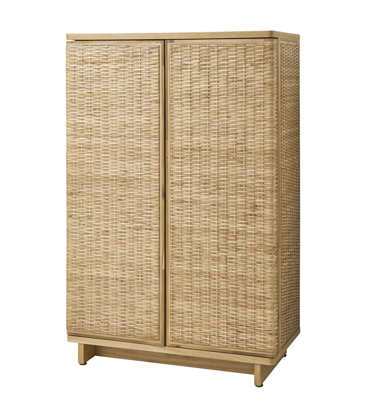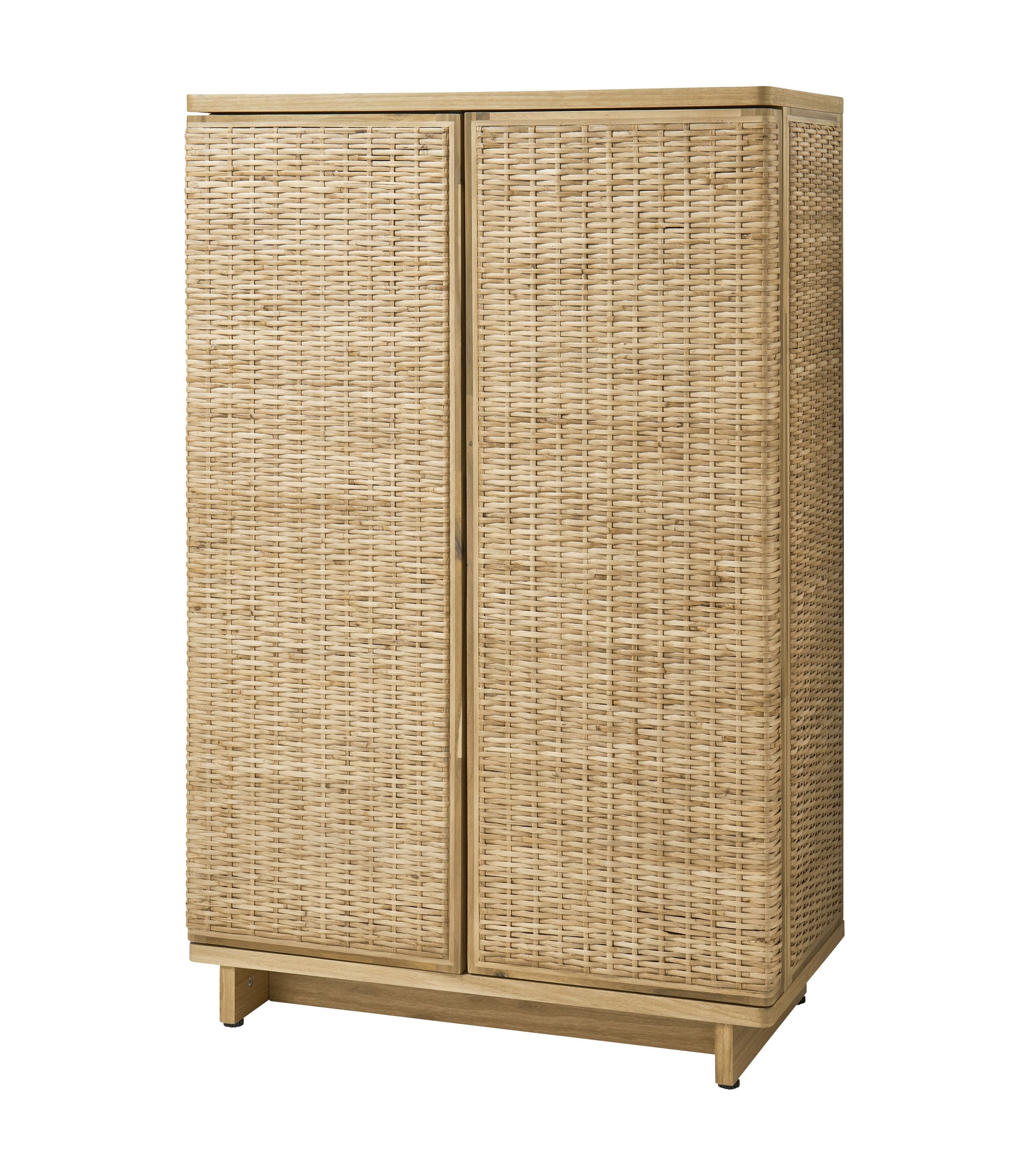 天然の籐の美しさが、本物の素材のよさを際立たせ、一つひとつのアイテムに微妙に異なる表情をつくり出します。扉や側面に籐を使用したキャビネットは、リビングルームの目隠し収納にぴったり。ナチュラルでぬくもりのある雰囲気を演出します。マグネット式のプッシュオープン扉といったディテールがエレガントなキャビネット。扉を開けると固定の棚板が2枚入っています。