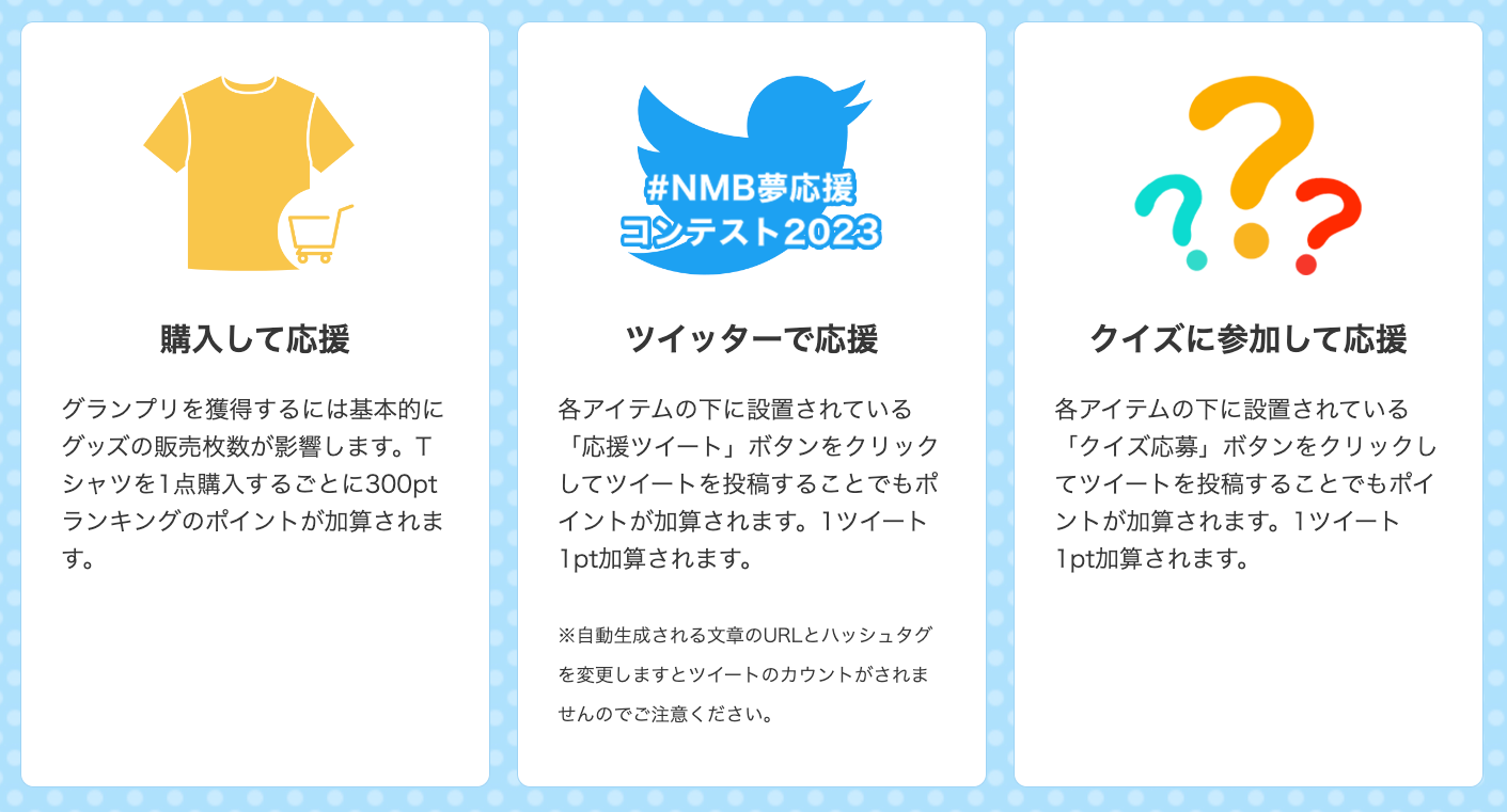 グランプリを獲得するには基本的にグッズの販売枚数が影響します。 T シャツを 1 点購入するごとに 300pt ランキングのポイントが加算されます 。