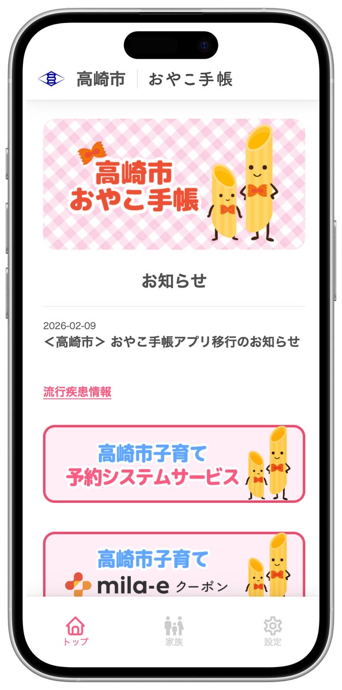 また 既存機能として、高崎市からのお知らせを月齢・年齢にあわせてタイムリーに受信できる「メール配信・プッシュ通知機能」、予防接種漏れや接種間隔ミスを防ぐことができる「予防接種AIスケジューラー」、成長グラフや乳幼児健診の記録など母子手帳の内容をマイページに記録できる「電子母子健康手帳 機能」なども 引き続きご利用いただけます。