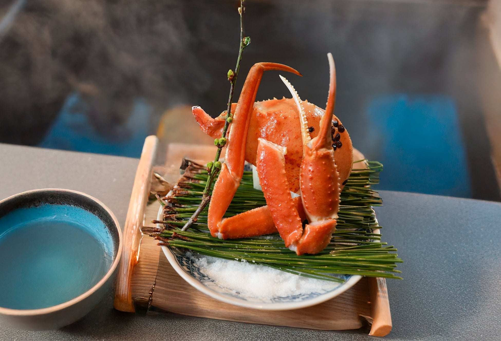 空庭テラス京都 別邸は、京都の中心部「四条河原町」に佇む、古都の絶景と天然温泉をご堪能いただけるホテルです。ホテルのレストラン 京懐石「東山」では、3月限定メニューとして料理長がこだわり抜いた「松葉蟹の天然温泉蒸し」をご用意いたします。当ホテルの自家源泉温泉を利用して蒸し上げることで、蟹の鮮やかな赤みが増し、身が引き締まります。鉄分やマグネシウムが豊富な温泉で蒸し上げた蟹料理は、蟹の甘味と旨味を引き出し、何もつけなくてもそのまま美味しくお召し上がりいただけるほどの深い旨みをご堪能いただけます。温泉とともに夕食を愉しみ、春の京都の風情を心ゆくまでご満喫ください。
