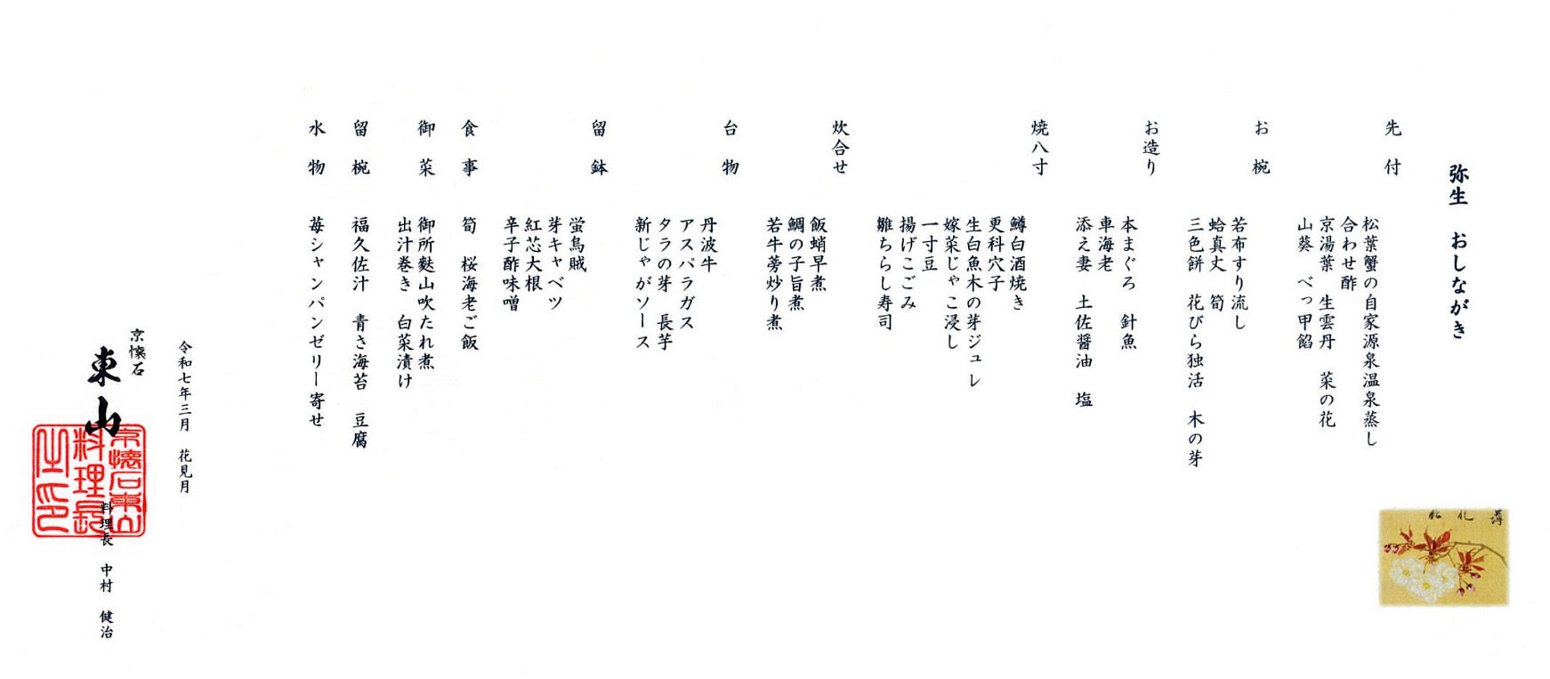 京懐石「東山」は、落ち着いた和の雰囲気と洗練されたインテリアが特徴のレストランです。全国から厳選した食材と京野菜を使用し、長年にわたり京料理の伝統と技法を極めてきた料理長・中村健治が、匠の技で美しい京料理を仕上げます。お客様からは「美しい盛り付けと美味しさに感動しました」「四季折々の食材を使用した料理が印象的で、特に魚料理が絶品でした」といったお褒めの声をいただいており、毎月変わるメニューを楽しみに、リピーターとしてご来店されるお客様も増えています。「東山」では、京懐石の王道を守りつつ、新しさや驚き、そして贅沢なひとときをご堪能いただけます。