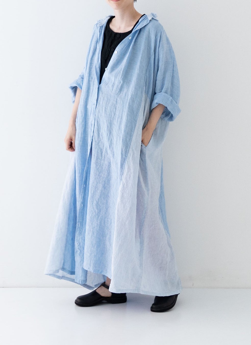 同色糸の糸色で織られたシャンブレー生地とストライプ生地を組み合わせてパターン配色にし、