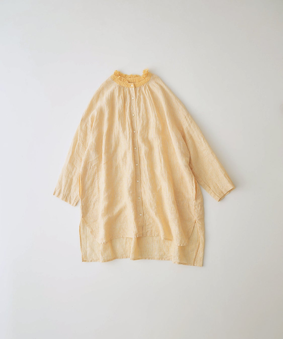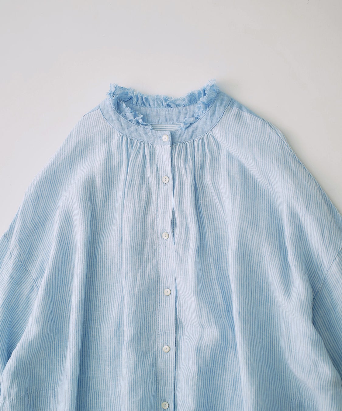 ラッフルデザインで襟元に特長を持たせ、ネックまわりに細やかなギャザーを効かせることで