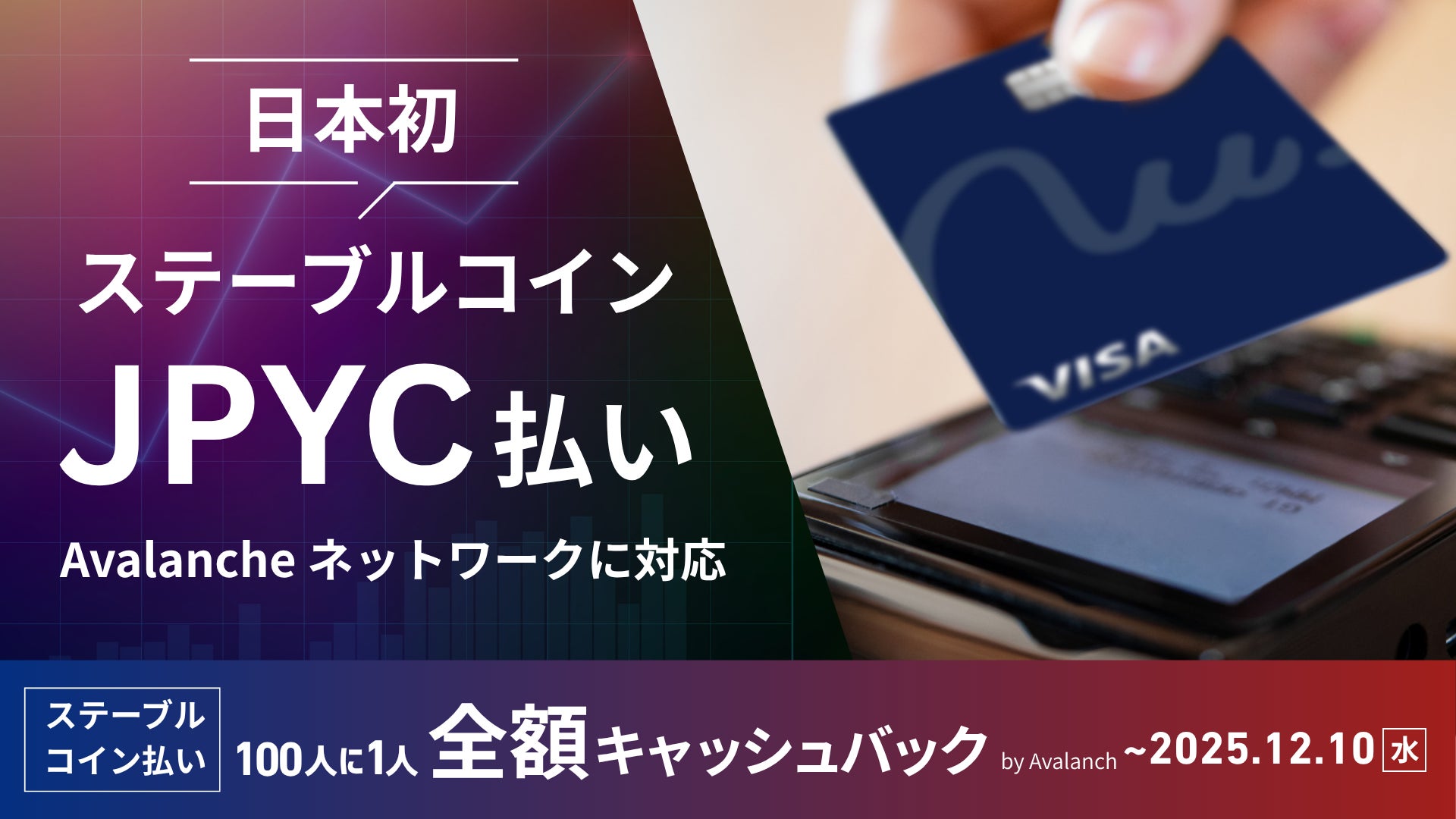 その第一弾として、次世代クレジットカード「Nudge(ナッジ、以下「ナッジカード」)」において返済手段として提供するステーブルコイン「JPYC」払いにおいて、サービス開始時点からAvalancheネットワーク上でのJPYCに対応するとともに、12月10日までの期間限定で「ステーブルコイン払い100人に1人全額キャッシュバック by Avalanche」キャンペーンを実施します。
