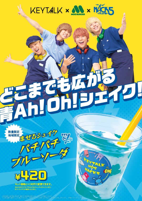 「MOSラジNACK5店」は、7月1日(土)より毎週土曜日の午前11時から放送しているラジオ番組で、フェスや数々の音楽シーンでも活躍している「KEYTALK」をメインパーソナリティーに迎え、“楽しい”をスローガンにさまざまなトークを繰り広げます。今回は、「KEYTALK」メンバーの寺中友将さんと八木優樹さんがラジオの中のハンバーガーショップを舞台に、寺中店長と八木副店長となり、さまざまなアイデアを出し合いながら考案した「まぜるシェイク パチパチブルーソーダ」をコラボ商品第1弾として新発売します。