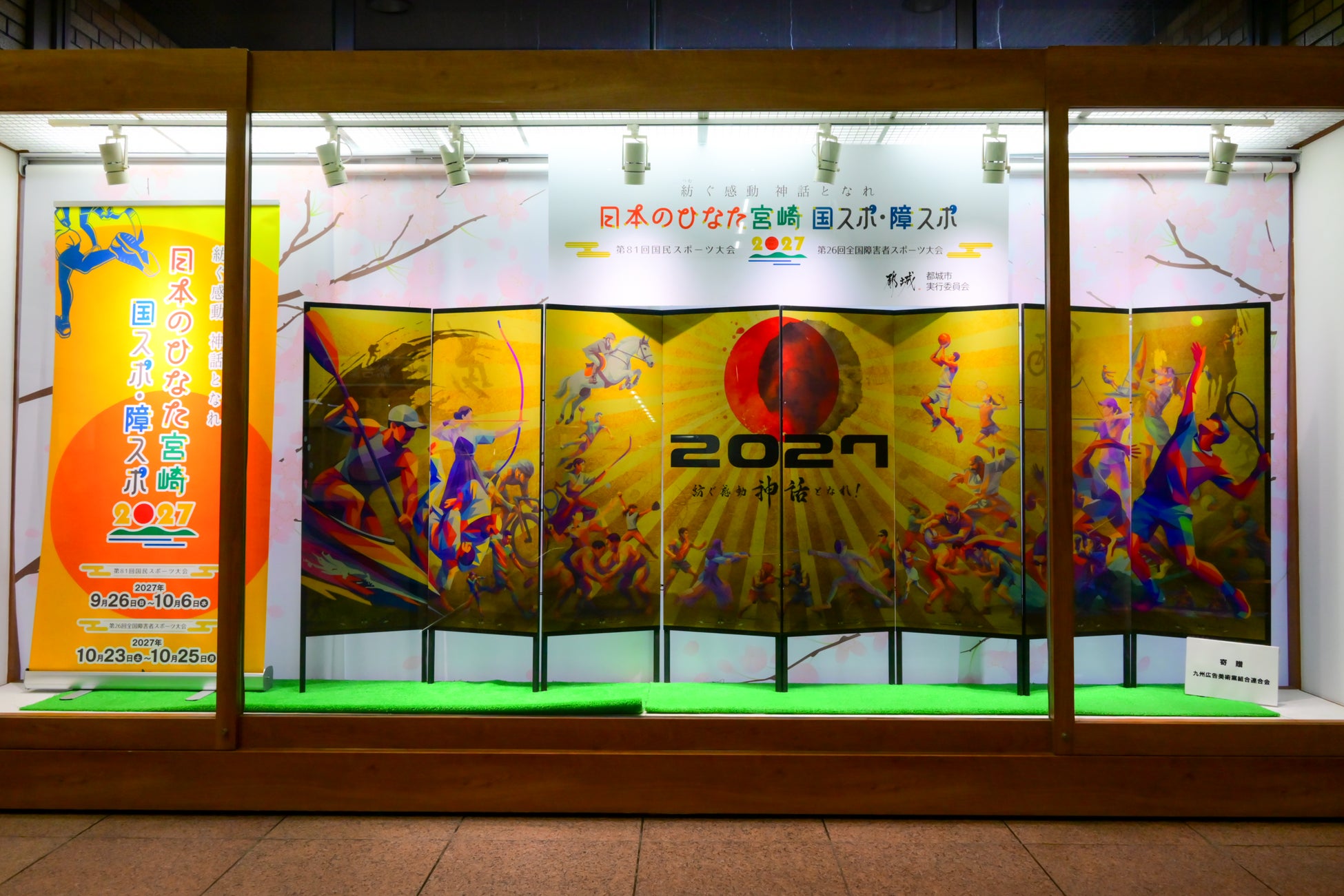 2027年に開催する「日本のひなた宮崎 国スポ・障スポ」をテーマに、九州広告美術業組合連合会が広告美術のコンクールを実施。応募作品の中から、都城市役所1階ロビーのPRブースには、各競技のイラストが描かれた金の屏風を彷彿とさせる看板を展示中です。その他の応募作品は、都城市内の小・中学校や地区公民館などに設置しています。