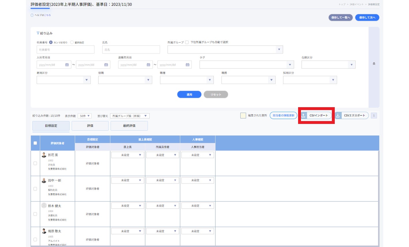 画像赤枠内の「CSVインポート」より、評価者の情報を入力したCSVファイルをインポートすることで、一括で評価者を設定することができます。