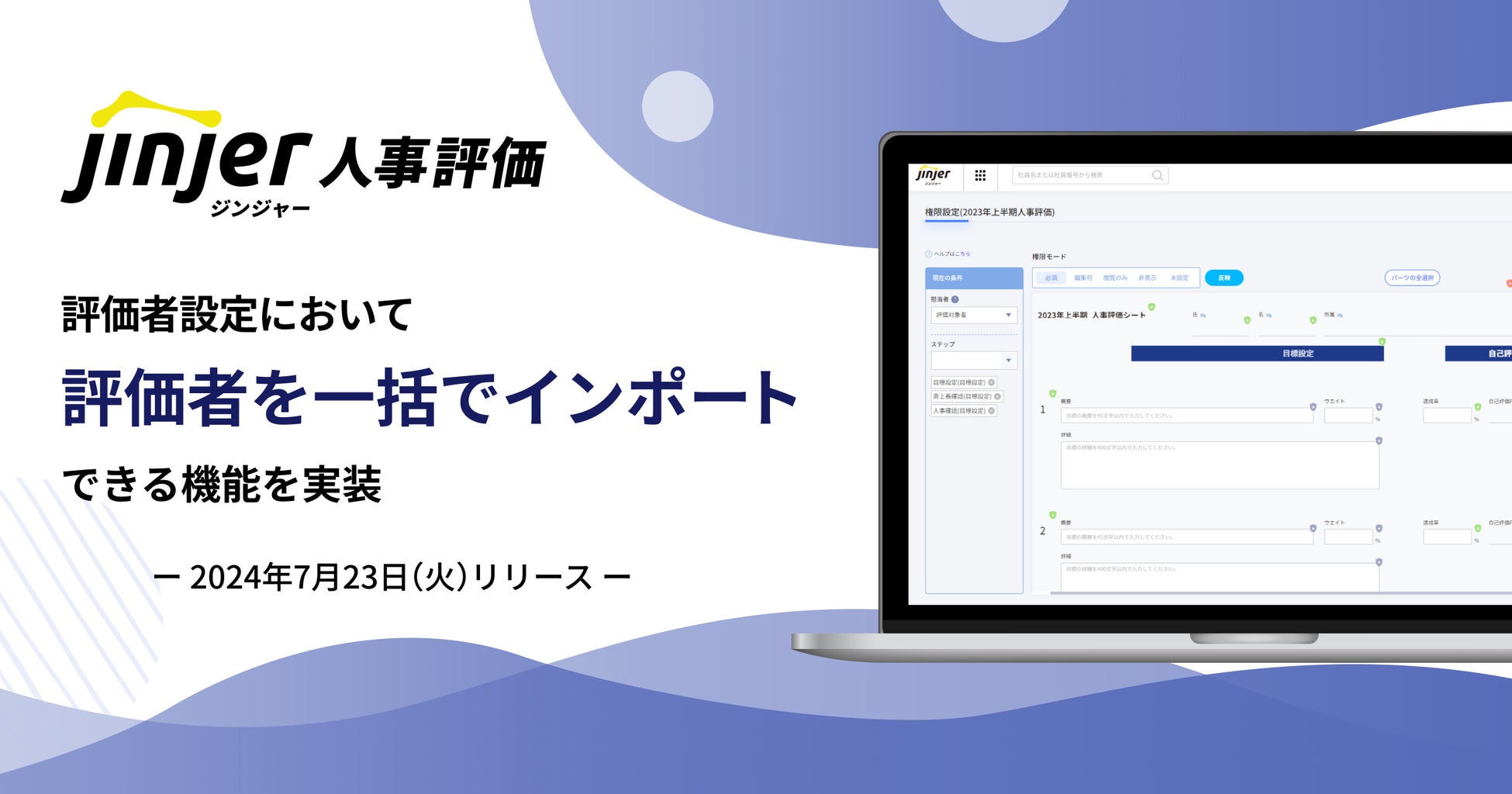 クラウド型人事労務システム「ジンジャー」を提供しているjinjer株式会社(本社:東京都新宿区、代表取締役社長:桑内 孝志)は、「ジンジャー人事評価」にて、評価者を設定する際に評価者を一括でインポートできる機能を7月23日(火)に実装したことをお知らせします。