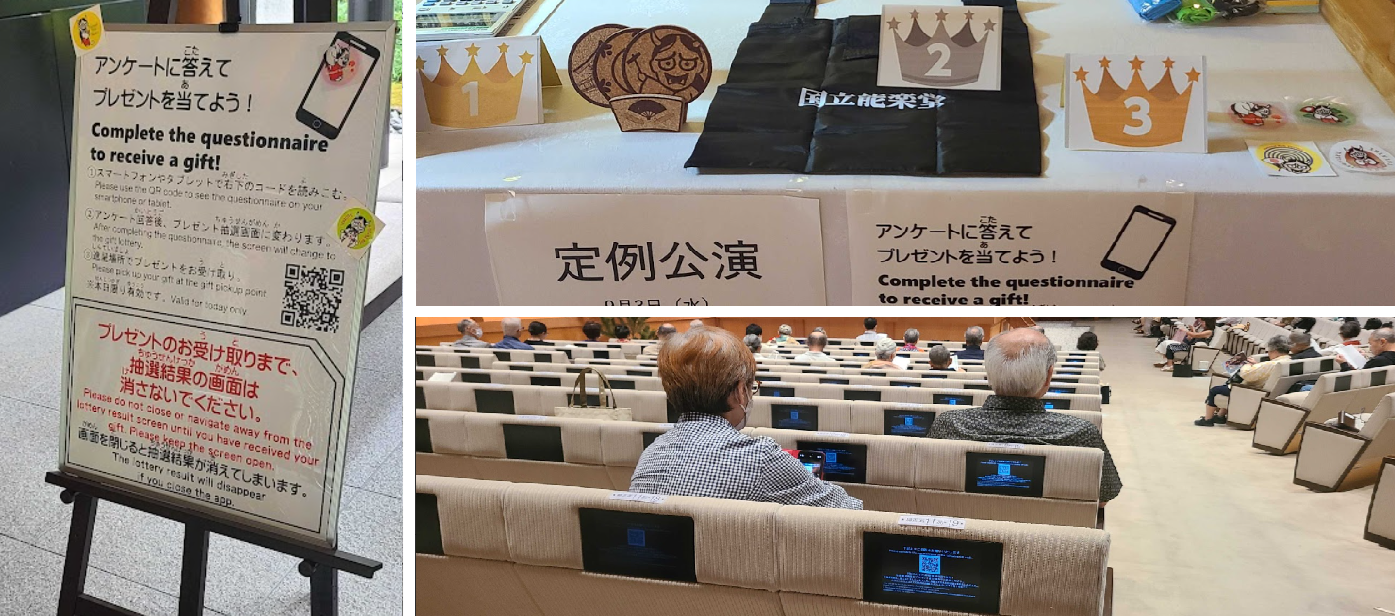 能・狂言の公演を通して日本の伝統文化を発信する国立能楽堂では、来場者アンケートを紙または字幕装置で実施していました。