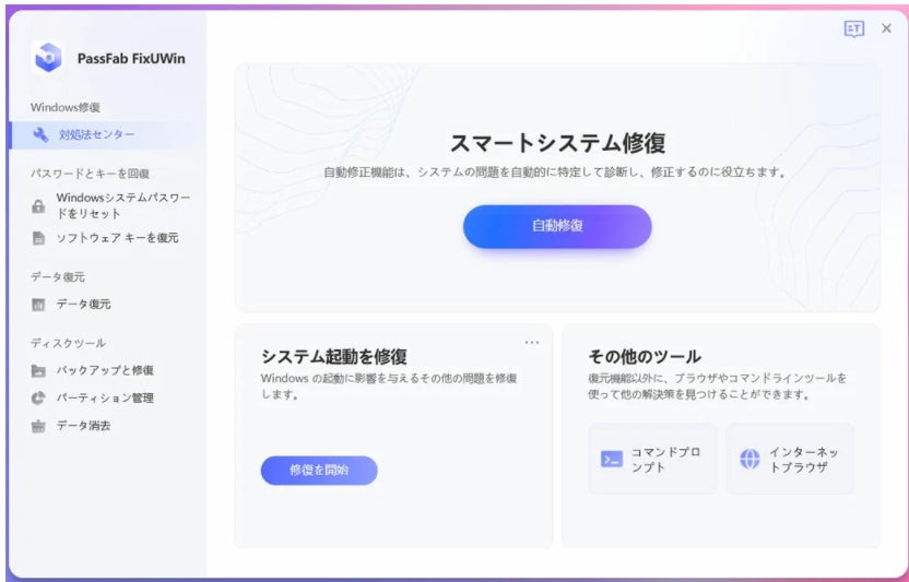 PassFab FixUWinはパソコンのエラーを修復する使いやすいツールであり、圧縮されたBOOTMGRブートローダーファイルによって引き起こされる問題を修正するためのワンクリック自動システム修復を提供します。