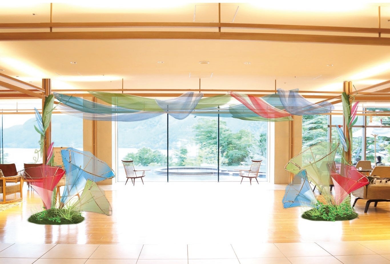 花咲くはなをりに相応しい、夏の花「あさがお」の装飾でお客さまをお出迎えします。7年間のはなをりの歩みをつぼみから開花に喩えて、あさがおの花で表現した装飾です。大きなあさがおの花は、はなをりの代名詞「水盤テラス」と共にフォトスポットとして、ご活用ください。ご宿泊後の会話にも花咲くような思い出の1枚を撮影いただけます。