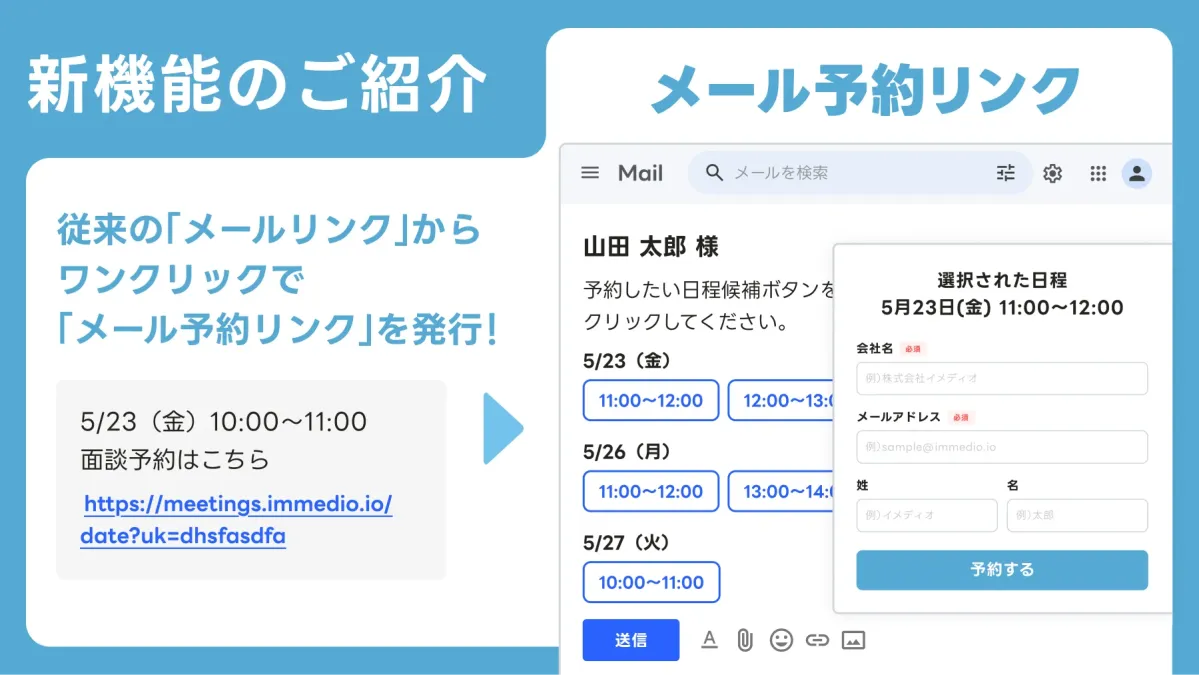 メールからそのまま商談予約が完了するimmedio、「メール予約リンク」機能を提供開始