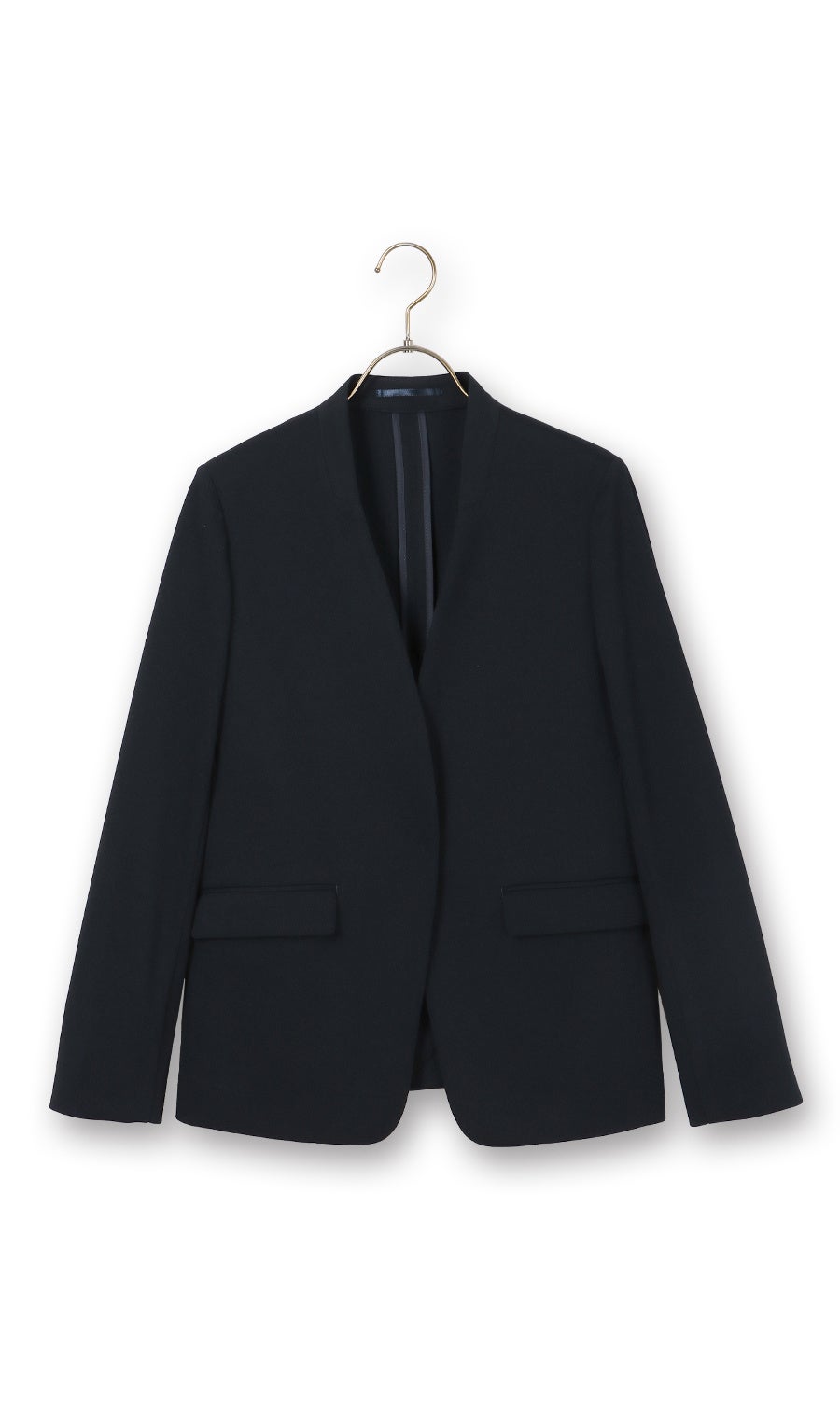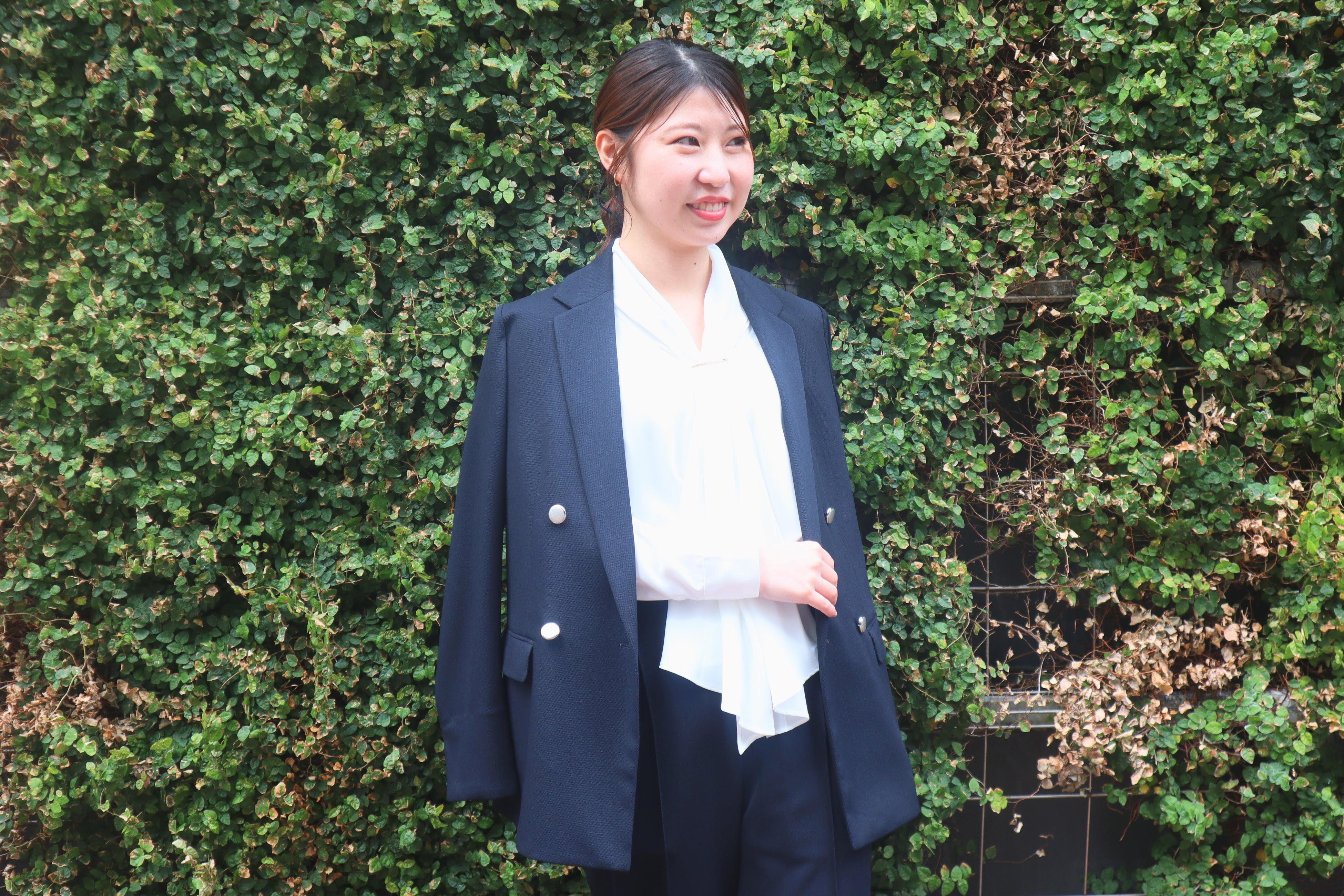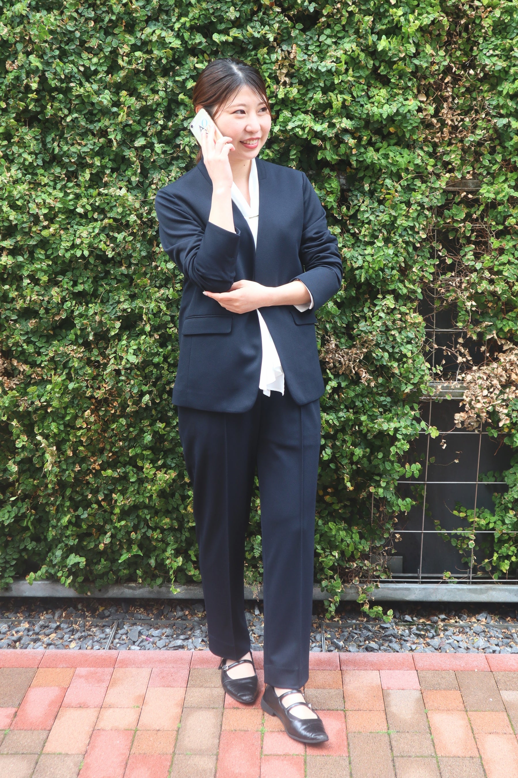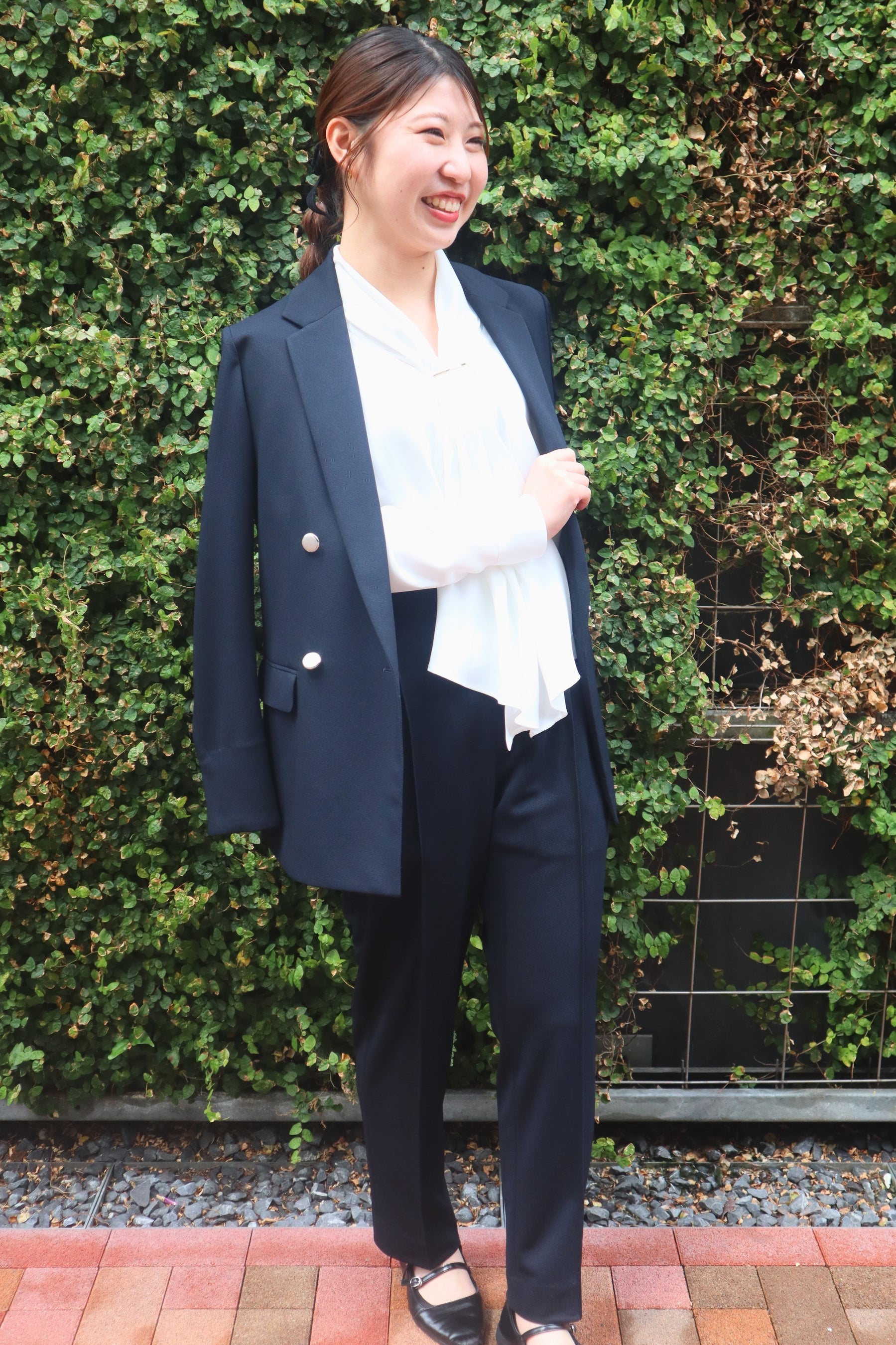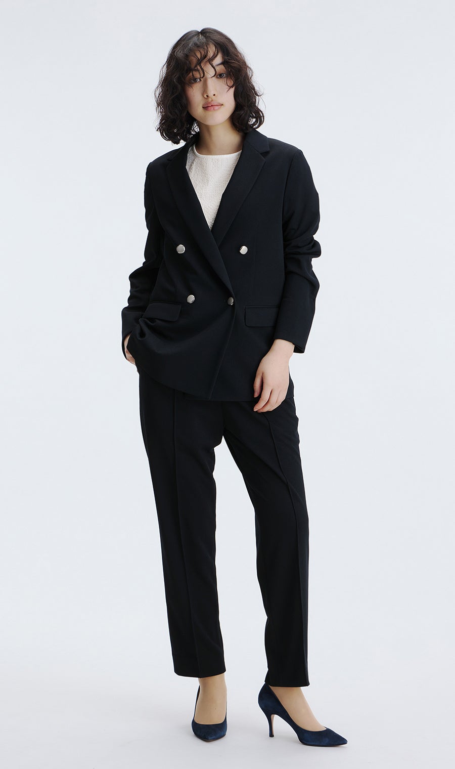 今回は、昨年好評だったダブルジャケットに加えて、Vカラージャケットとテーパードパンツを企画。Vカラージャケットは、ダブルジャケット同様に裏地がない作りにしているため、軽くさらっと羽織ることができ、オフィスの冷房対策としても活躍します。またテーパードパンツは、プリーツ部分を縫いつけるピンタック仕様にすることで、立体的かつスタイルアップ見えする他、後ろウエスト部分をゴム仕様にしているためストレスなく着用できます。