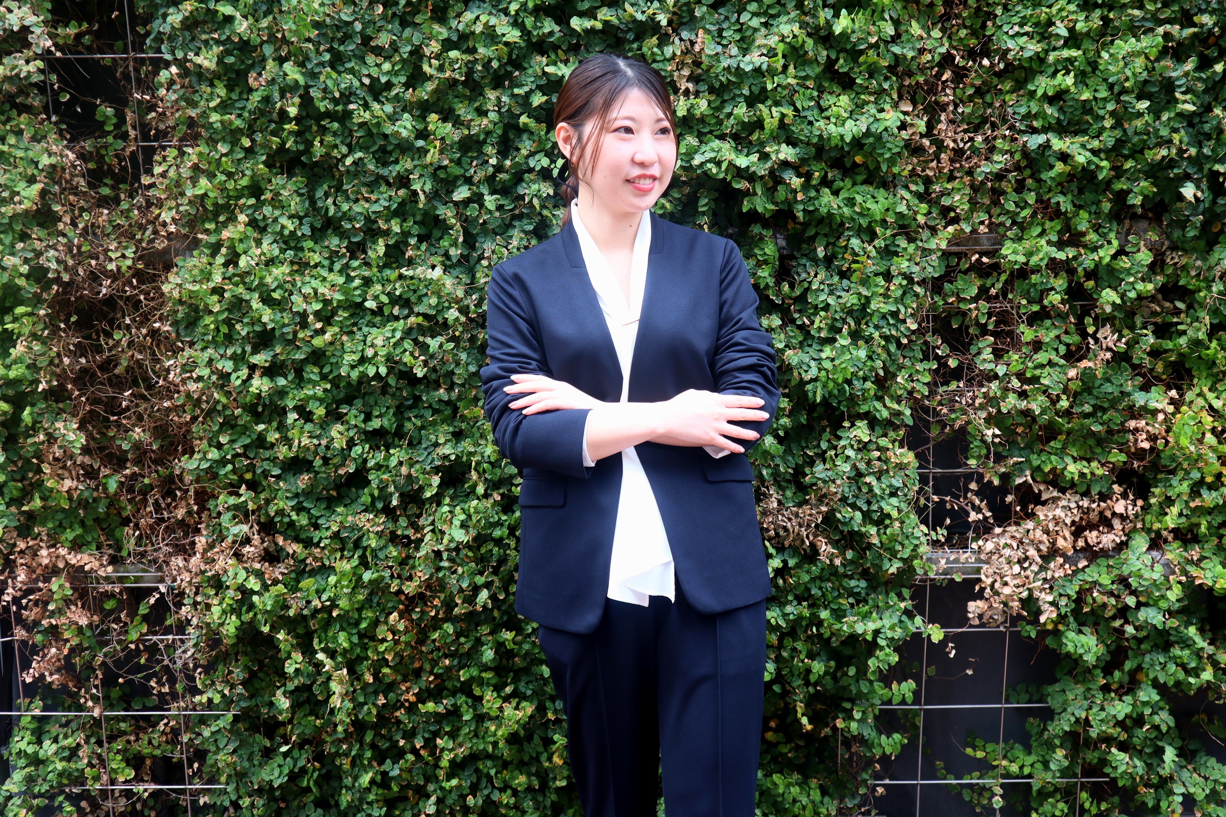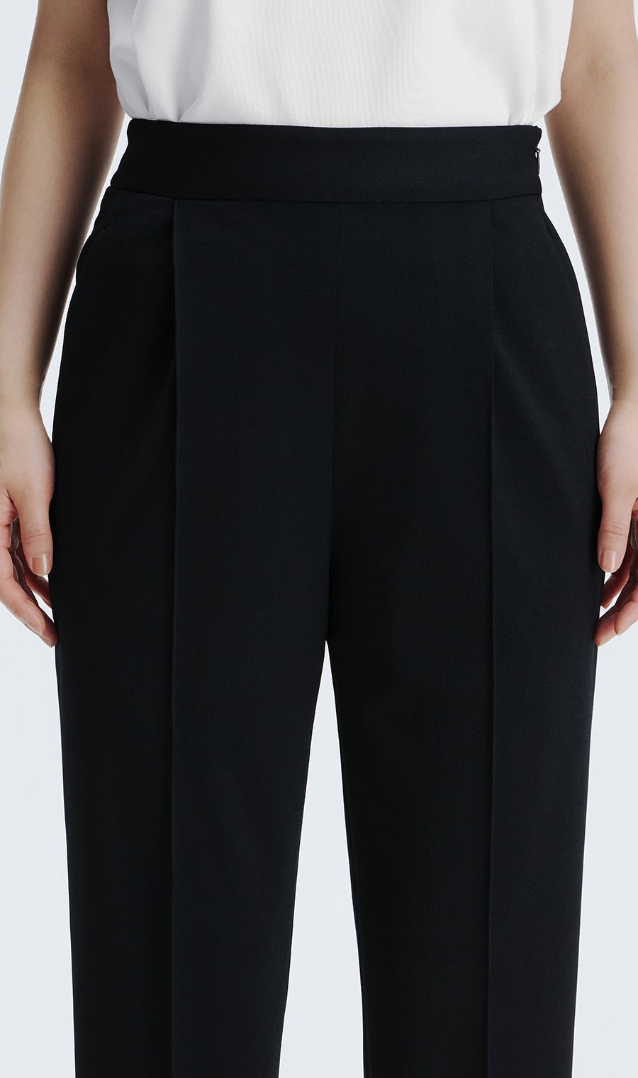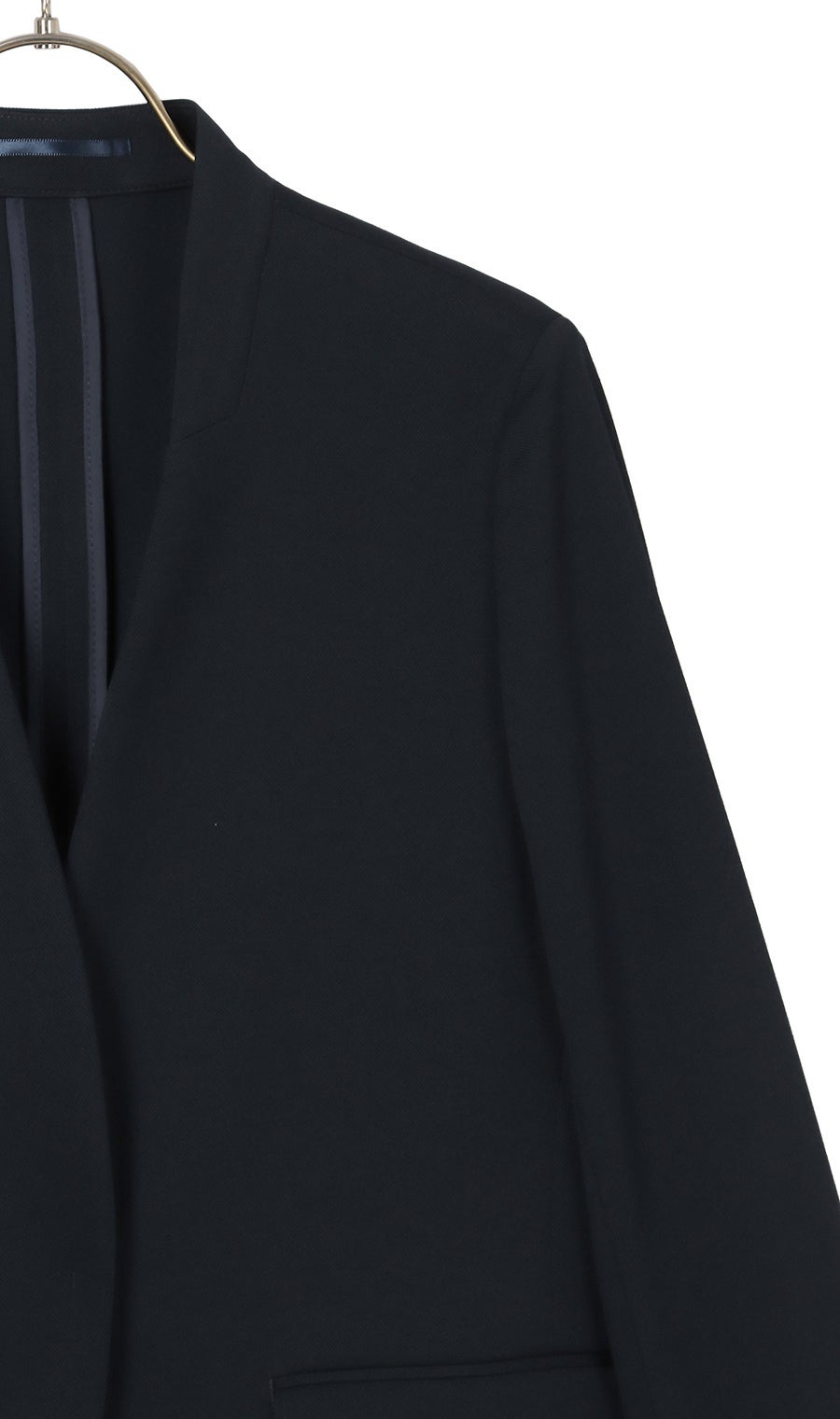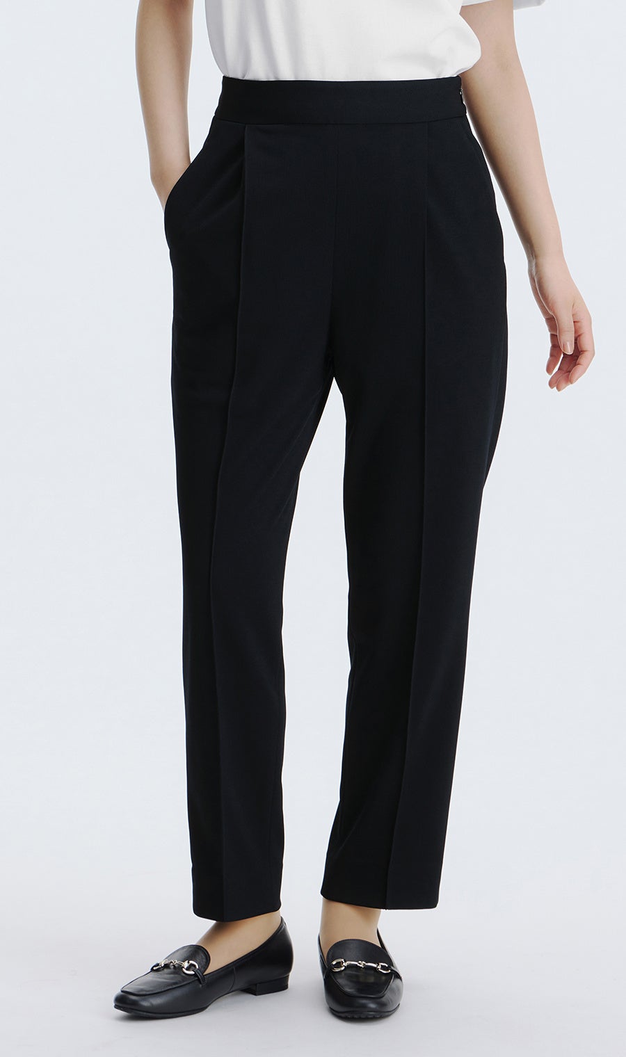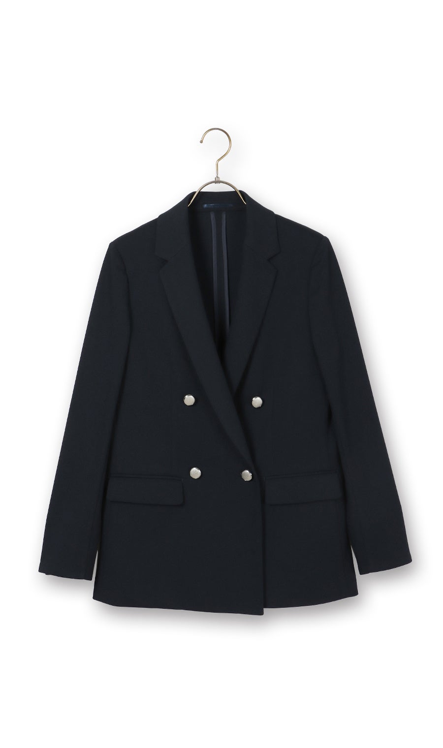 今回は、昨年好評だったダブルジャケットに加えて、Vカラージャケットとテーパードパンツを企画。Vカラージャケットは、ダブルジャケット同様に裏地がない作りにしているため、軽くさらっと羽織ることができ、オフィスの冷房対策としても活躍します。またテーパードパンツは、プリーツ部分を縫いつけるピンタック仕様にすることで、立体的かつスタイルアップ見えする他、後ろウエスト部分をゴム仕様にしているためストレスなく着用できます。