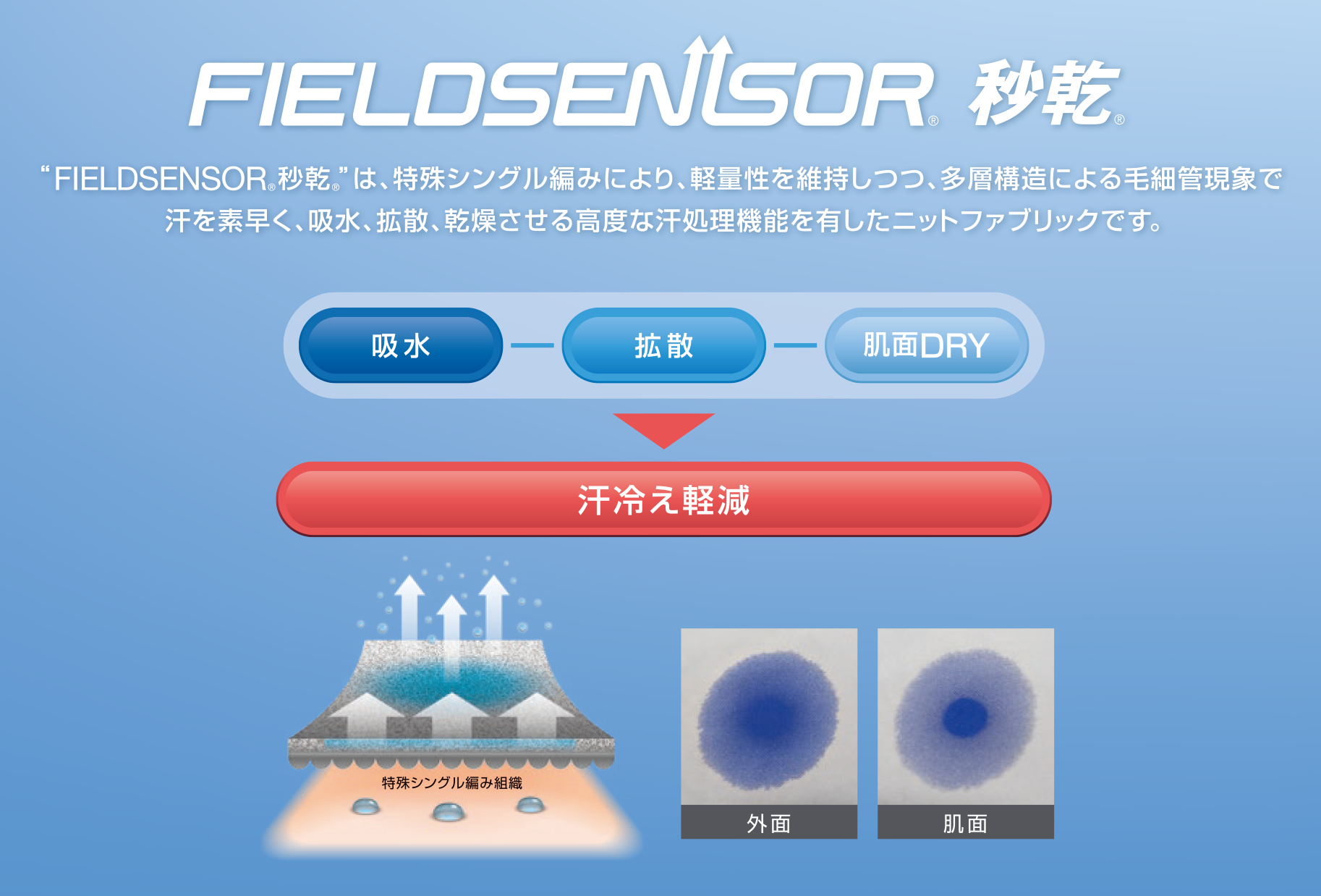 『FIELDSENSOR(R)秒乾(R)』は、毛細管現象※の原理を利用し汗を素早く吸水、拡散、乾燥させる東レ株式会社(本社:東京都中央区)の素材です。