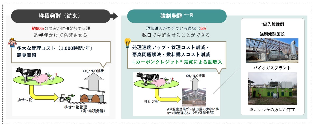 鶏・豚・牛の家畜の排せつ物に強制発酵設備を導入することにより発酵速度を上昇させ、発酵過程で発生するメタン(CH₄)や一酸化二窒素(N₂O)を削減し、その削減分をJ-クレジットとして認証する仕組みです。