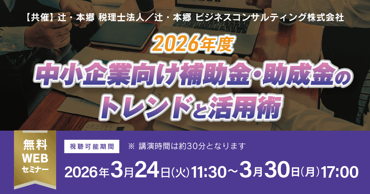 辻・本郷 税理士法人(本社:東京都新宿区、理事長:桑木小恵子)は、辻・本郷 ビジネスコンサルティング株式会社(本社:東京都千代田区、代表取締役社長:金子寿一)と共催で、2026年3月24日(火)より「2026年度 中小企業向け補助金・助成金のトレンドと活用術」セミナーを開催いたします。 本セミナーは、「どの補助金が自社に最適か分からない」という経営者の皆様のお声にお応えし、2026年度の膨大な支援策の中から「今、本当に検討すべき制度」を30分に凝縮して解説いたします。最大50億円規模の大型成長投資から、カタログから選ぶだけの省力化投資、そして名称変更で注目される「デジタル化・AI導入補助金」まで、主要カテゴリーを厳選。採択事例を交えた具体的な活用イメージを提示し、補助金をどのように経営戦略に組み込み、強固な成長基盤を築くための判断指針をお伝えします。
