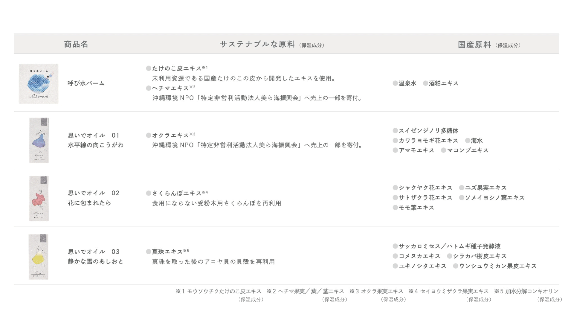 第一弾の商品として発売する「呼び水バーム」と「思いでオイル」は、まさに日本らしい言葉の語感と自然の美しさからインスピレーションを得て作りあげたものです。1つ1つの商品の向こう側に豊かな自然や懐かしさを感じる瞬間を、水彩画のようにゆらめくアートな世界や、言葉やテクスチャー、香りなどで表現しています。