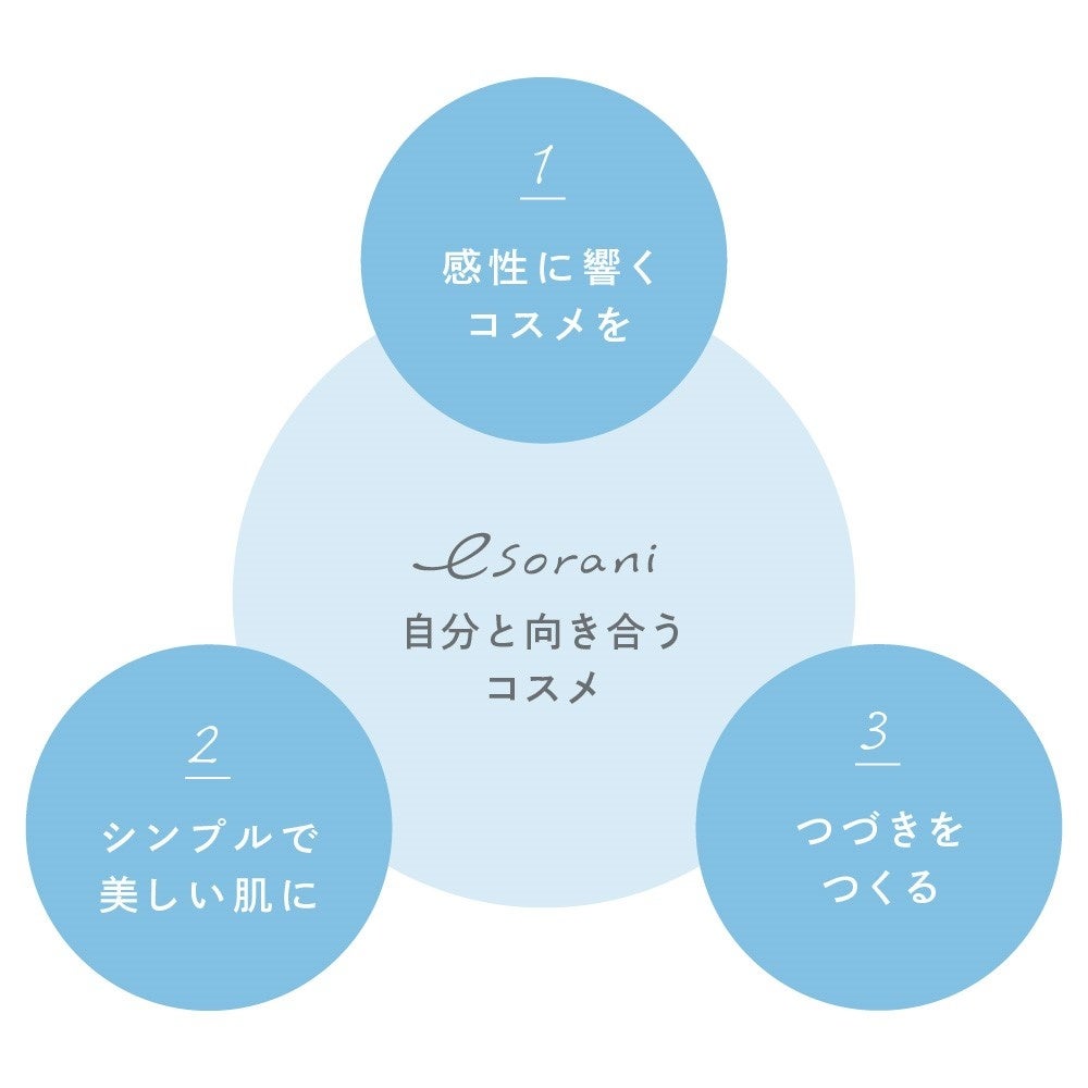 「esorani」は、心やすらぐ香りやテクスチャー、ときめきや癒しを感じるアートなデザインで、心と肌に響くコスメをお届けするコスメブランドです。肌の透明感に着目し、国産原料などこだわりの保湿成分を配合。うるおいにこだわった処方設計でキメの整った美しいお肌へと導きます。名前の由来は、すこし疲れたときに「空」を眺めて一息つく瞬間と、アートな空想に耽る「絵空ごと」を掛け合わせた言葉。季節の空気感を感じることや、物思いに耽ること、そんな瞬間を表現した独自の名前になっています。