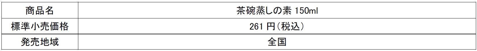 本商品は、既存商品であるカレンダータイプの「茶碗蒸しの素カレンダー」の瓶タイプとして発売します。「茶碗蒸しの素150ml」は、子どもから大人まで満足できる味わいの専用調味料であり、1本で20人前の茶碗蒸しを作ることが出来る経済的な商品です。茶碗蒸しをご家庭で作るという方は全体の約30%、外食チェーンで食べる方は約25%と言われています。家庭内喫食の浸透や物価上昇の長期化、外食控えから手作り需要への流入が見込めることから、「茶碗蒸しの素150ml」の発売に至りました。