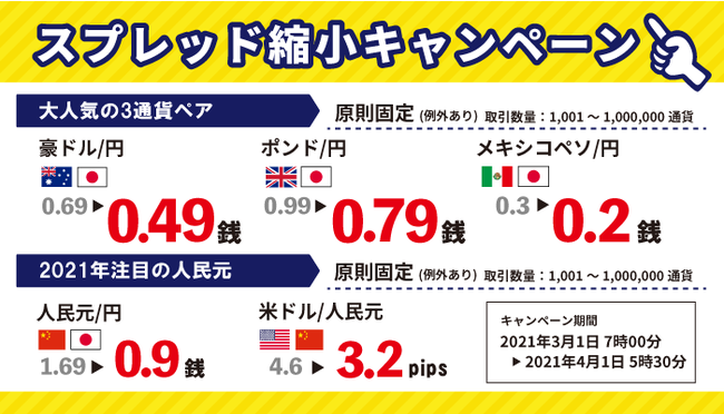 SBI FXトレード株式会社(本社:東京都港区、代表取締役社長:藤田 行生、https://www.sbifxt.co.jp/、以下「当社」)は、2021年3月1日AM7:00より、豪ドル/円、ポンド/円、メキシコペソ/円、人民元/円、米ドル/人民元の5通貨ペアにおいてスプレッド縮小キャンペーンを開始致しましたのでお知らせ申し上げます。