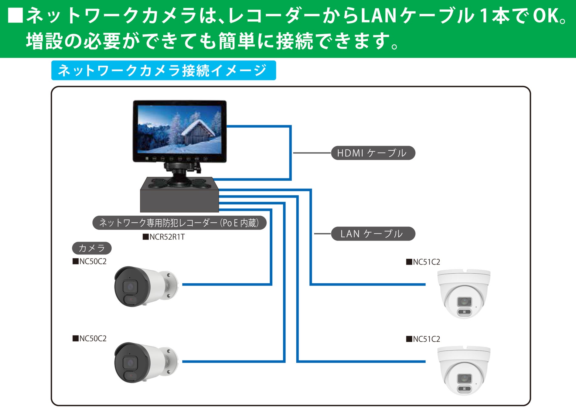 PoE内蔵ネットワークレコーダーを使用すれば、カメラからLANケーブル1本で接続すればOK。
