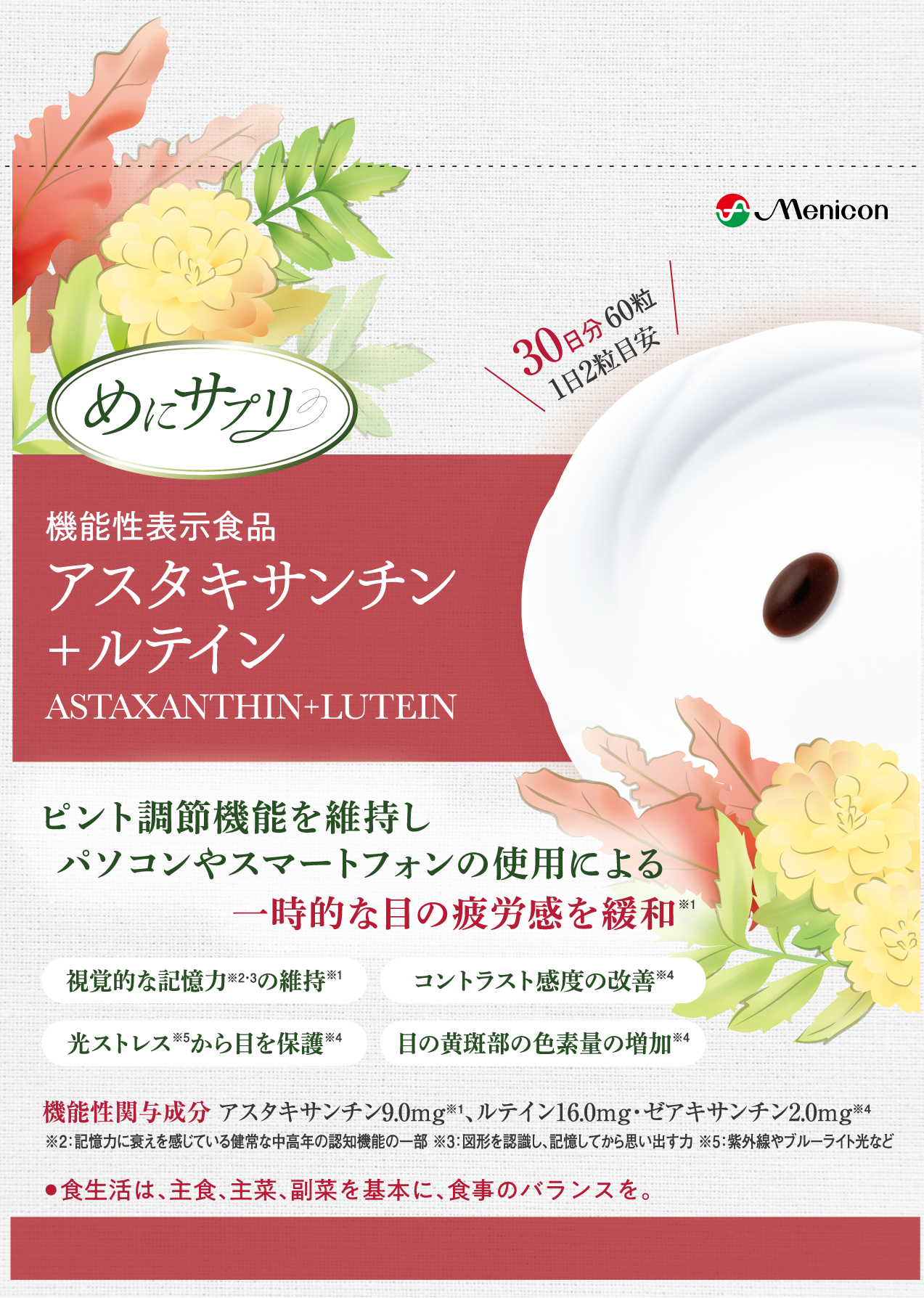 株式会社メニコン(本社:名古屋市中区葵三丁目21-19、代表執行役社長:田中英成)は、機能性表示食品(※1)「めにサプリ アスタキサンチン+ルテイン」を、新発売したことをお知らせいたします。