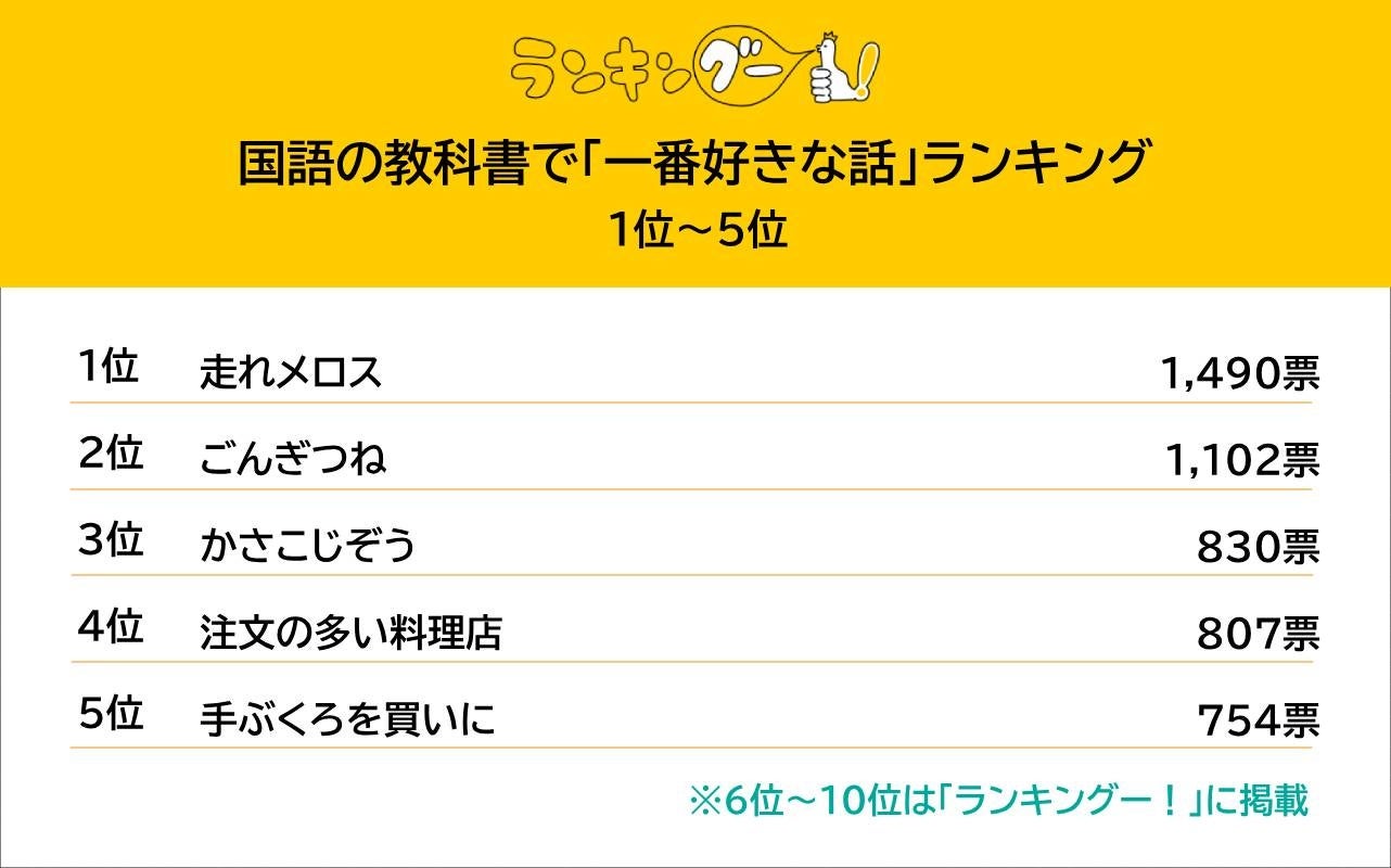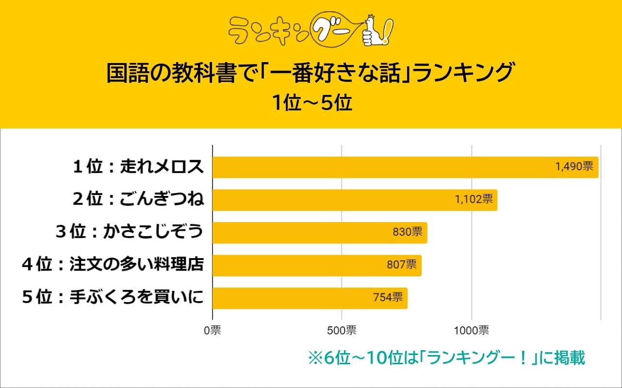 ランキングー!では国語の教科書に掲載された文学作品をピックアップし、投票者が「この話、好きだったなぁ!」と感じる物語を調査。全年代の男女(性別回答しないを含む)10,696名にアンケートを行いTOP10を決定しました。ここではTOP5をご紹介します。