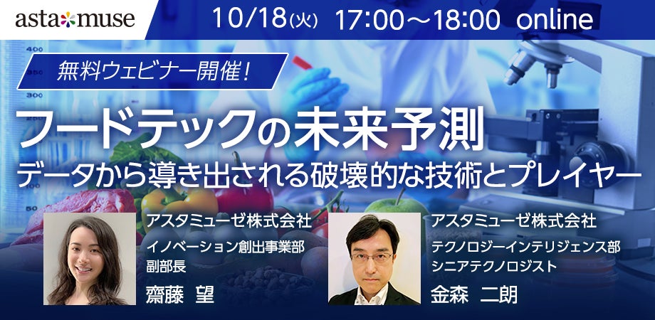 アスタミューゼ株式会社(本社:東京都千代田区、代表取締役社長 永井歩)は、2022年10月18日(火)17:00~18:00に、「未来推定」の手法により導出したフードテック領域で伸びる技術やプレイヤーについて解説する無料ウェビナー「フードテックの未来予測~データから導き出される破壊的な技術とプレイヤー~」を開催いたします。