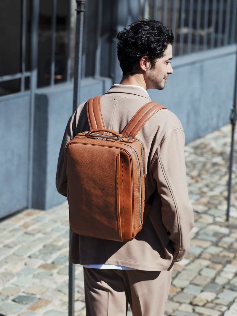 「トラベル バックパック」(税込 108,900 円)は、ちょっとした旅や出張に最適な、革製リュックです。ファスナー付きの収納スペースを、メーン2カ所(背側と中)と外側1カ所の3カ所に設けています。革は、水に強い「防水ファインレザー」を主に、手に触れるハンドル部分やファスナーの持ち手にエイジングが楽しめるイタリアの高級牛革「バケッタ・ミリングレザー」と、背面やショルダー部分にしなやかで柔らかい「ソフト牛革」を使い分けています。そうして、革の魅力とバックパックの機能性を最大限引き出しています。背面と肩ベルトにはクッション材を中に入れており、長時間背負っていても疲れにくい設計にしています。