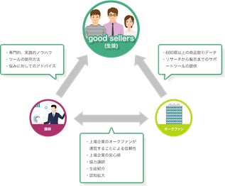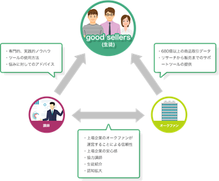 企業様の在庫を「good sellers」という事業を通して、オークファンで育成したセラーが国内外問わず販売することができるフローを構築することで、個人様の力による在庫流動化を実現していきます。
